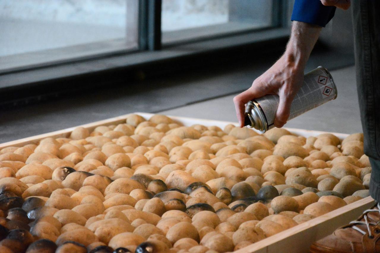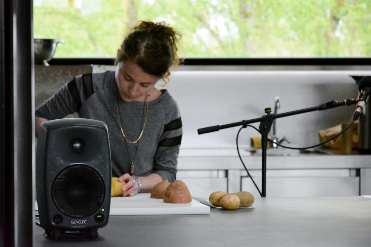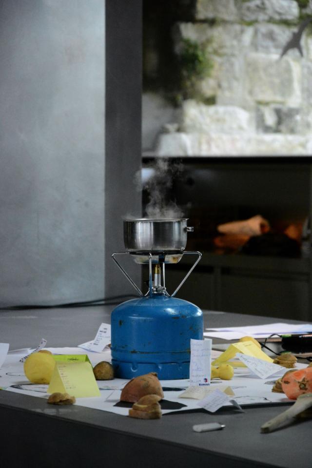 Le duo Fo[…]nd Vo[…]x propose dans cette performance une recette augmentée de la purée de pommes de terre, où chaque étape de l’élaboration est décortiquée minutieusement. À partir de la préparation du plan de travail, en passant par les différentes manières d’éplucher les tubercules, jusqu’à l’assaisonnement final, chaque étape est passée au crible. La répétition des gestes, la cadence de chaque phase, leur précision suggèrent un parallèle entre travail de cuisine et celui à l’usine.