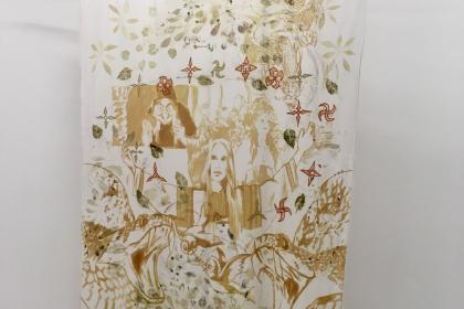 ses grandes tentures peintes à la rouille de fer, ou martelées de feuilles.
