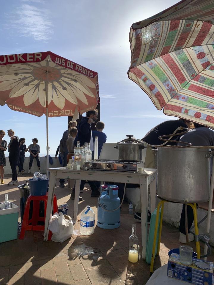 Le dernier projet du duo (Marion Mounic et Julien Ribis) est de fabriquer de l’alcool de Capri-Sun®. Une boisson pour les ados inventée en Allemagne dans les années 60 avec eau de source, jus de fruits à base de concentré, sucres et acide ascorbique. Il s’en vend plus de 6 milliards de poches souples par an, très loin derrière coca-cola, mais pour beaucoup de consommateurs c’est une alternative au soda américain. Une sorte de pied de nez résistant, pourtant… c’est ce dernier qui commercialise Capri-Sun. Bref, encore une arnaque, trop sucrée, polluante… Un piège pour mômes. L’installation Capri-Seum pousse le curseur. Le seum est ce poison de l’âme, un dépit ou un ressentiment. Bricolage d’alambic, cocotte-minute menaçante, bonbonne de gaz, le feu et le statut de l’alcool, interdit, clandestin, caché forment un sous-texte d’une résistance claire aux venins du monde. L’action Capri-Seum n’est finalement plus réellement performative tellement un temps long est nécessaire. A Sète le dispositif et la macération, à Lisbonne la lente distillation et la dégustation pour un verre partagé qui tente de distiller le désastre qui nous hante ou nous menace.