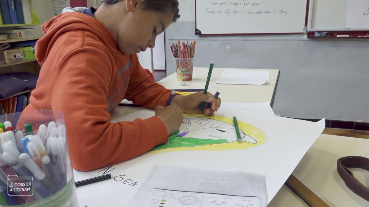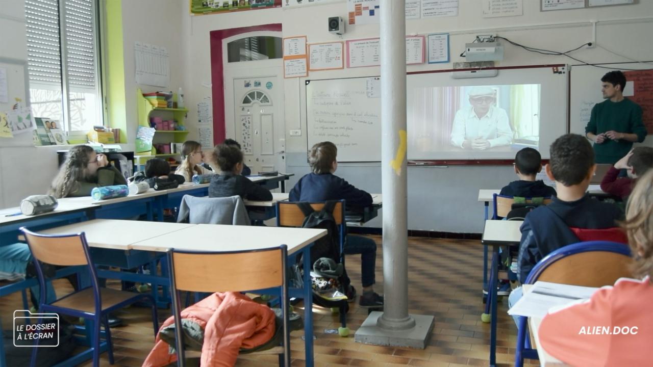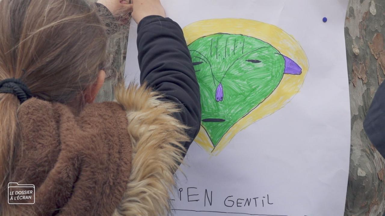 À ses deux tiers, mon film abordera le moment où le jeu de rôle vole en éclat. Quand, au lendemain de sa visite dans la classe, l’alien est arrêté faute de pouvoir présenter ses papiers. Les élèves qui ont alors développé une forte empathie pour lui ne supportent pas cette idée. Avec l’institutrice nous décidons de rétablir la vérité, ce qui donne lieu à une série d’entretiens filmés dans lesquels j’essaye d’amener les élèves à prendre conscience du jeu de rôle.