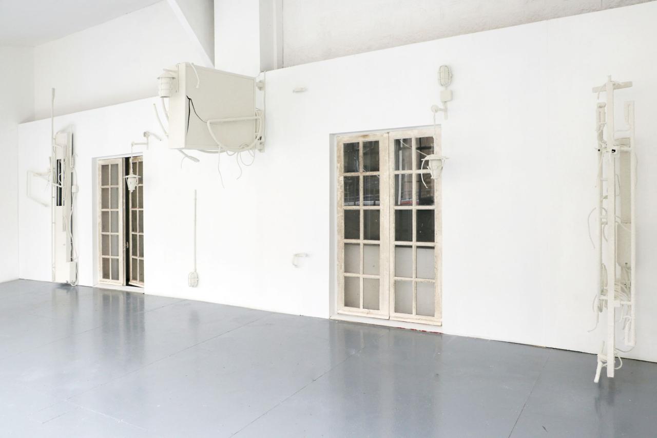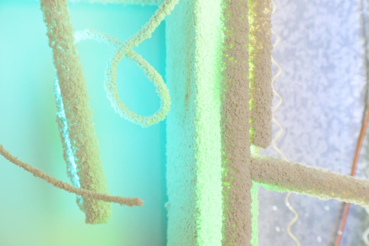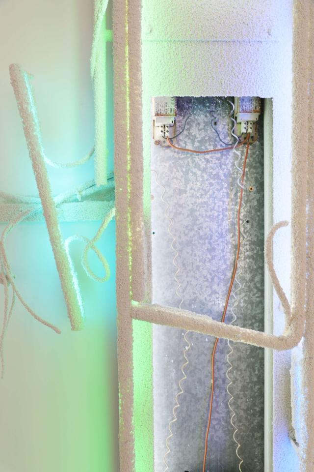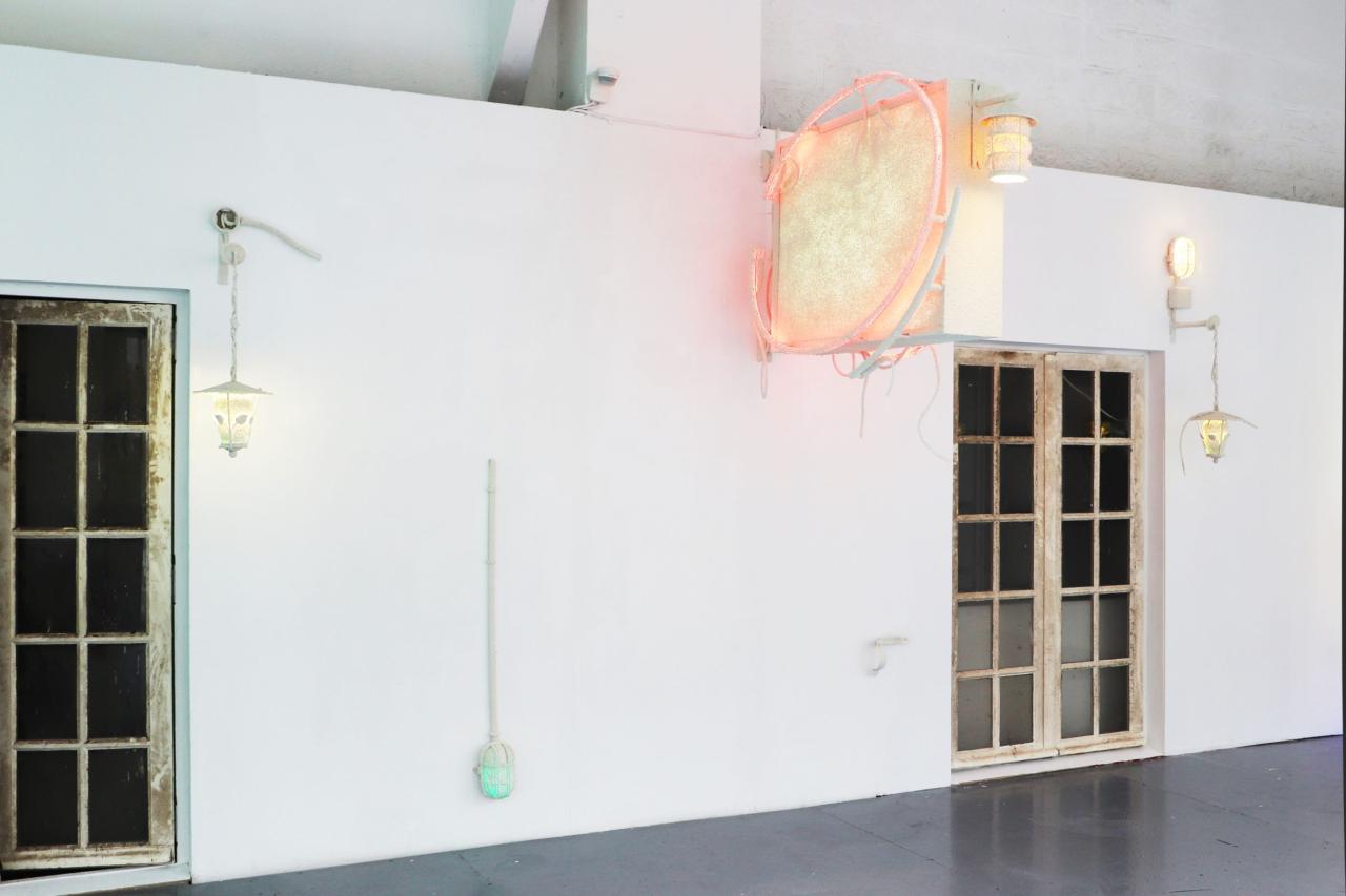 Bar parallèle, 2022, site specific installation, old signs assembly, architecture elements, electrics cables, sheats, transformers, wall render, detail