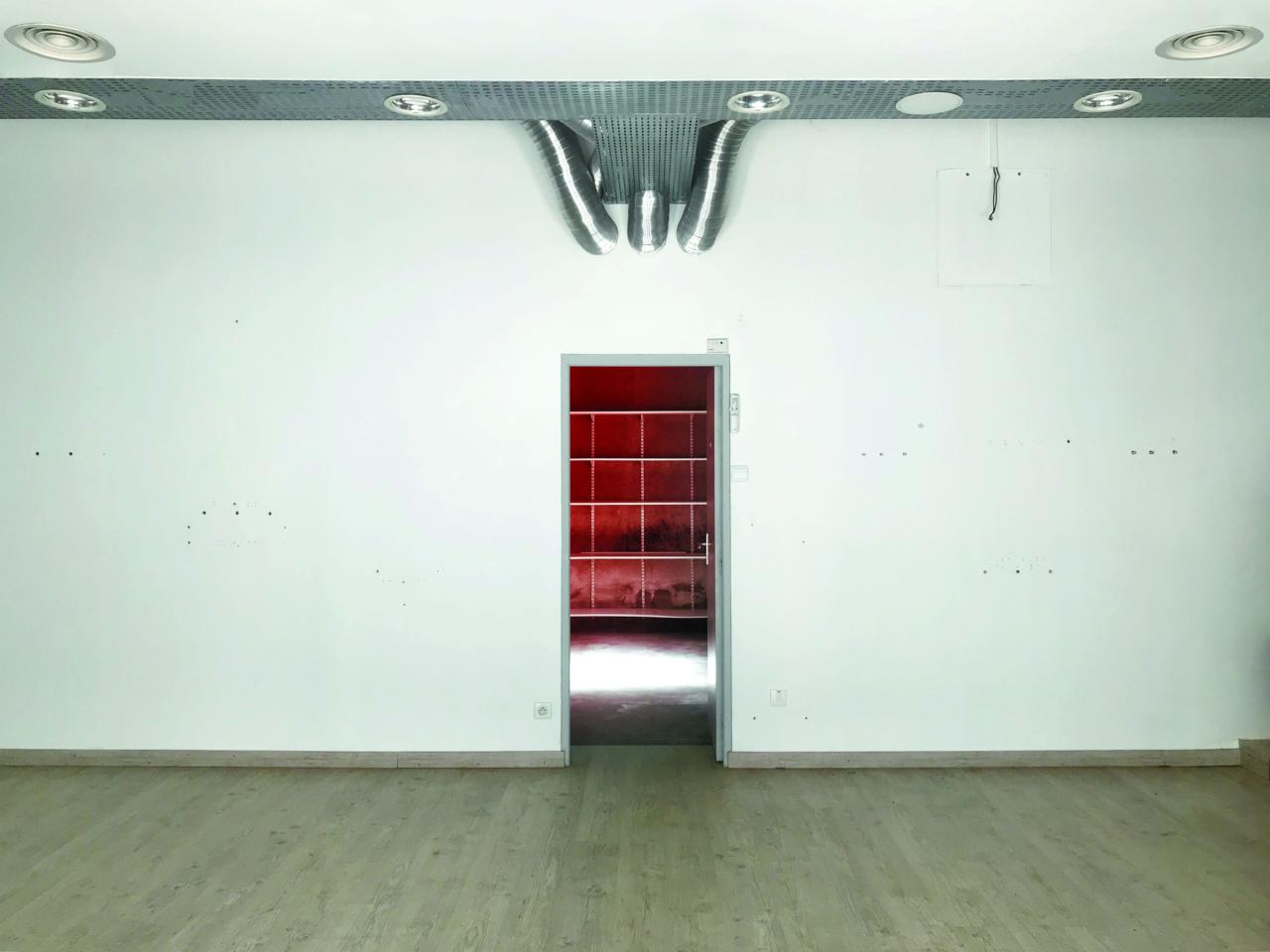 Depuis l’extérieur, il semblerait que rien ne se passe dans cet espace. Le commerce s’est évaporé ne laissant aucune trace de son activité. Son absence rend maintenant visible ce qui était alors invisible. Rampes lumineuses, plafonniers, câbles dénudés et services à liqueur, il ne reste plus que le vide en guise d’architecture intérieure.