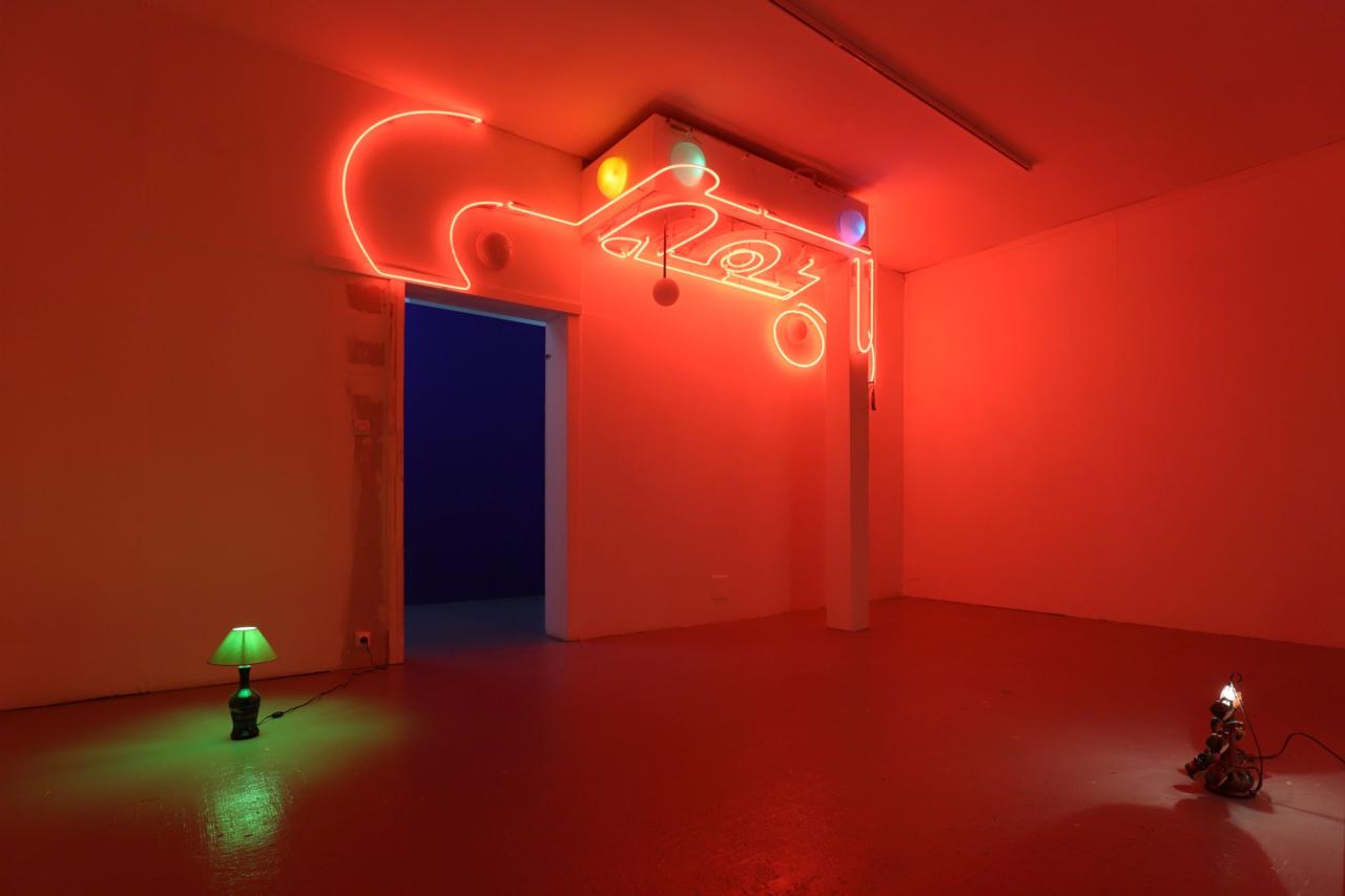 Bar parallèle, 2022, site specific installation, old signs assembly, architecture elements, electrics cables, sheats, transformers, wall render, exhibition view at 2Angles, visual arts and contemporay dance residency in Flers, France, 2022