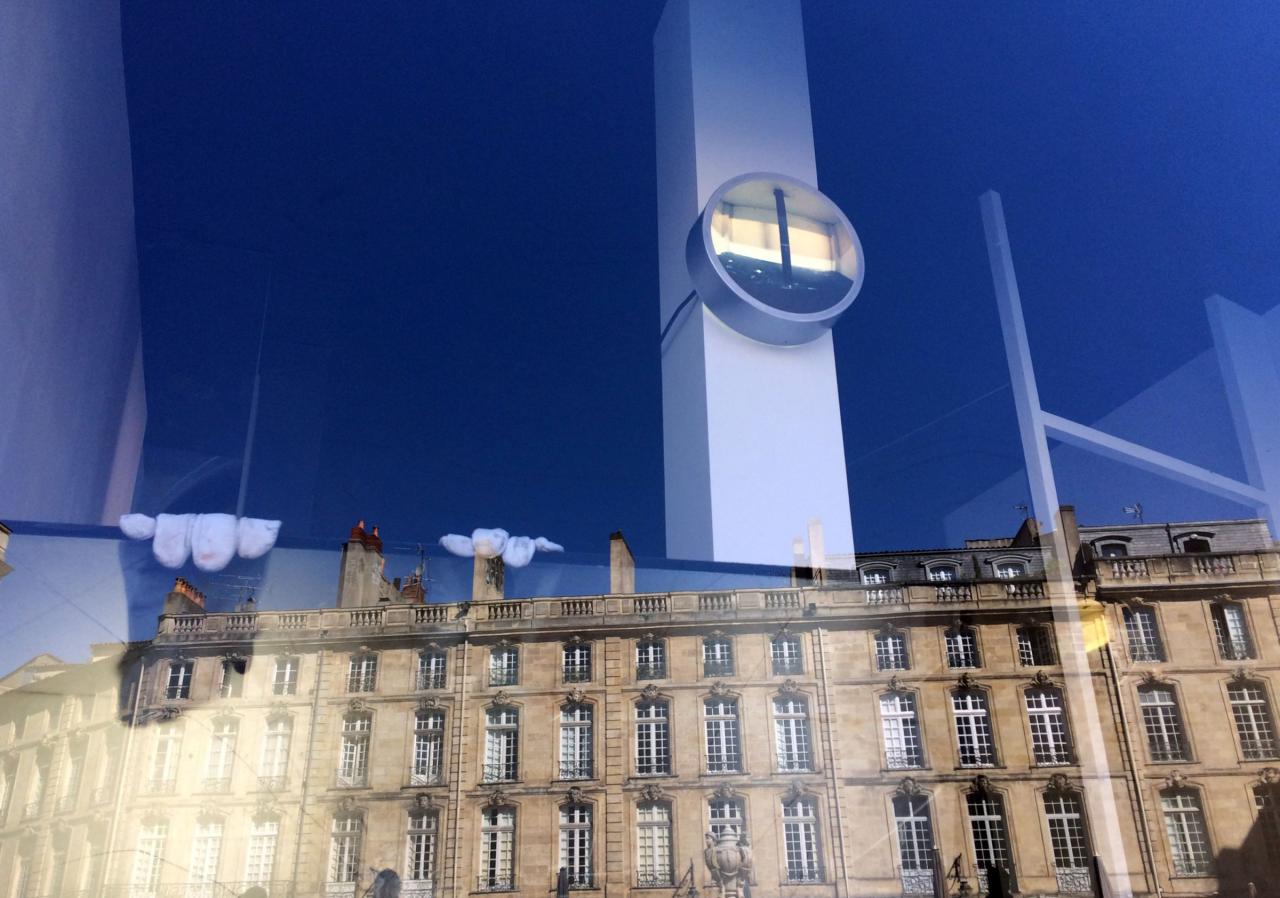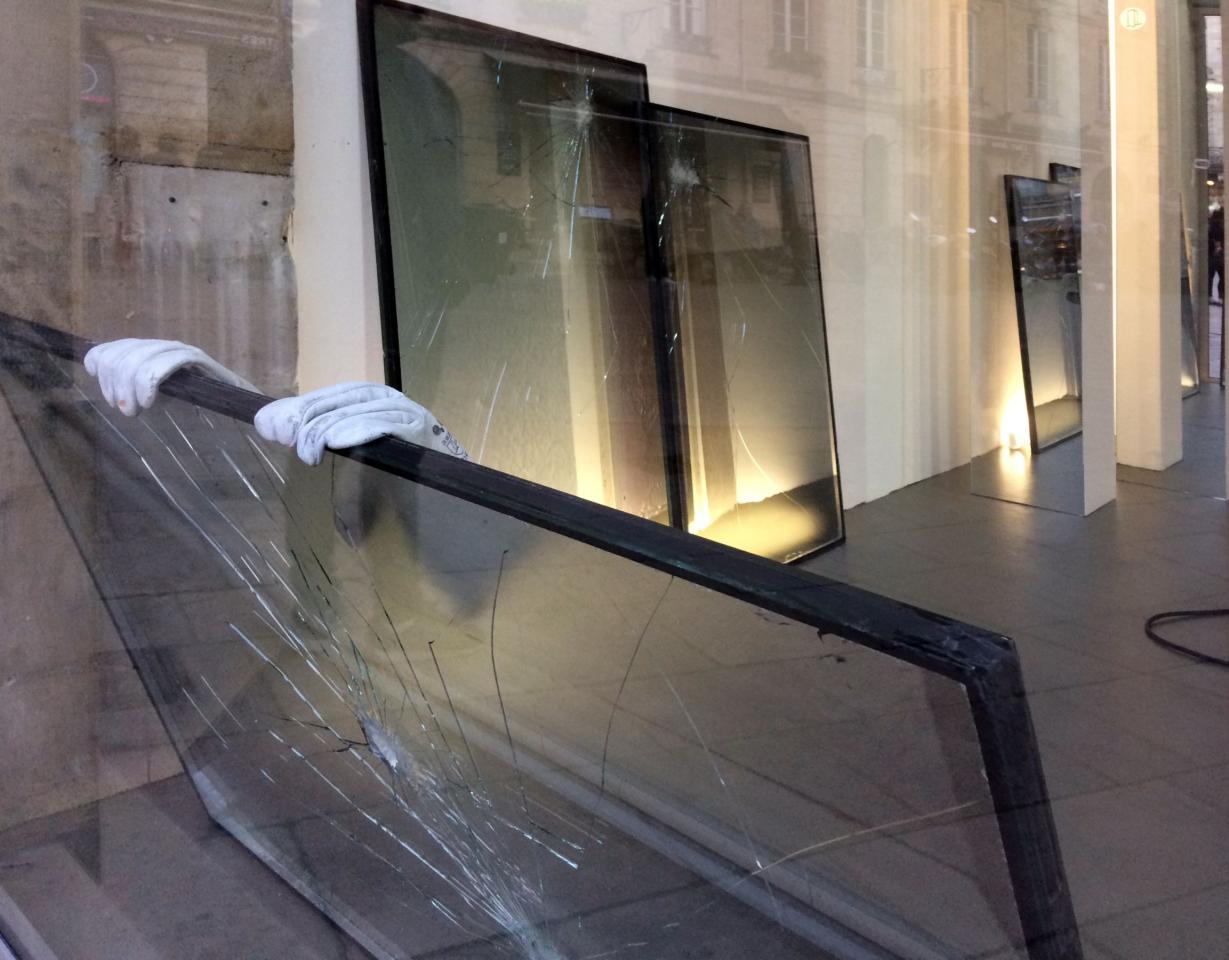 Survival, 2017, installation, prints on tarpaulin, window sticker prints on glass, wood, metal, painting and light systems out of use, Crystal Palace storefront, Bordeaux (France), 2017