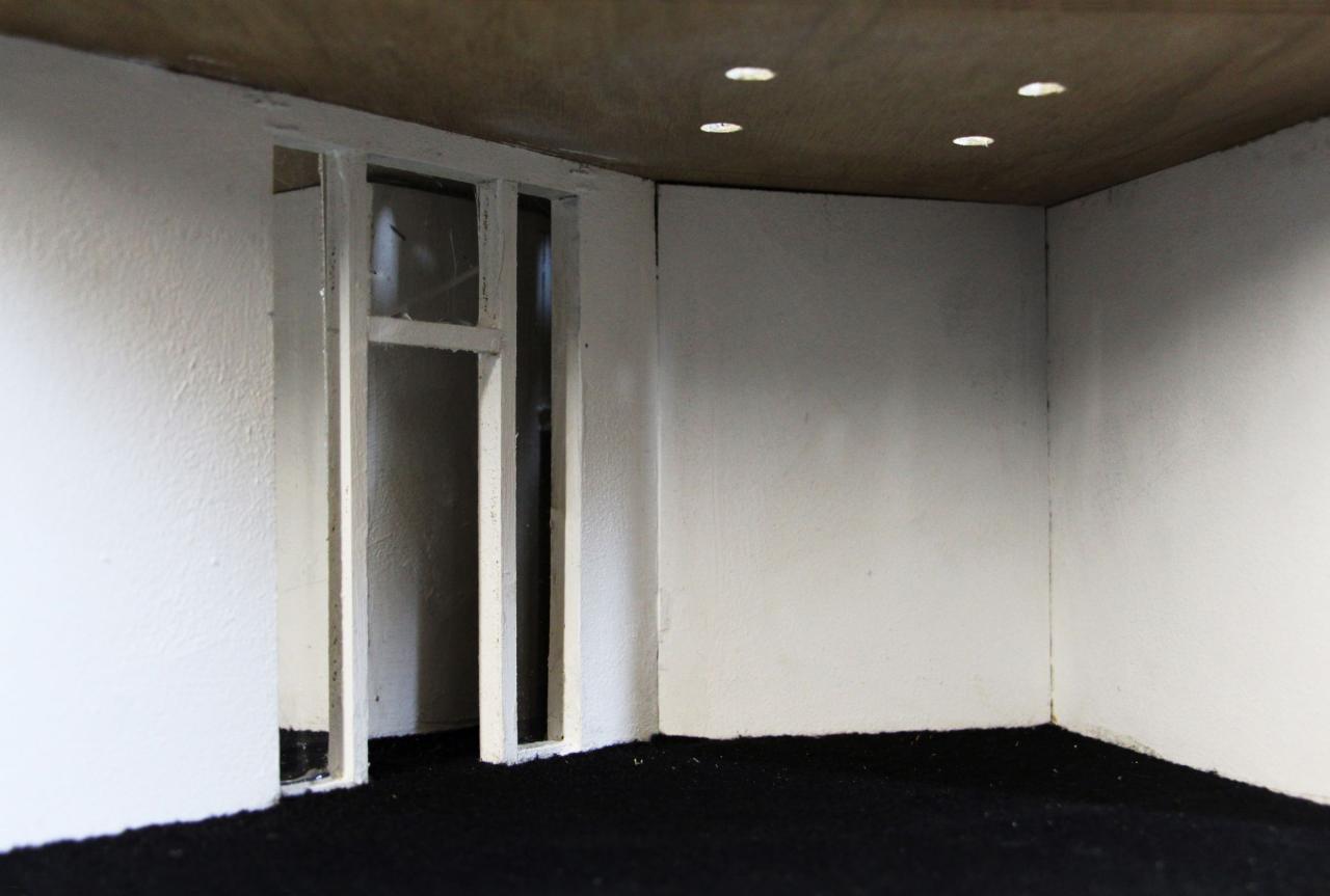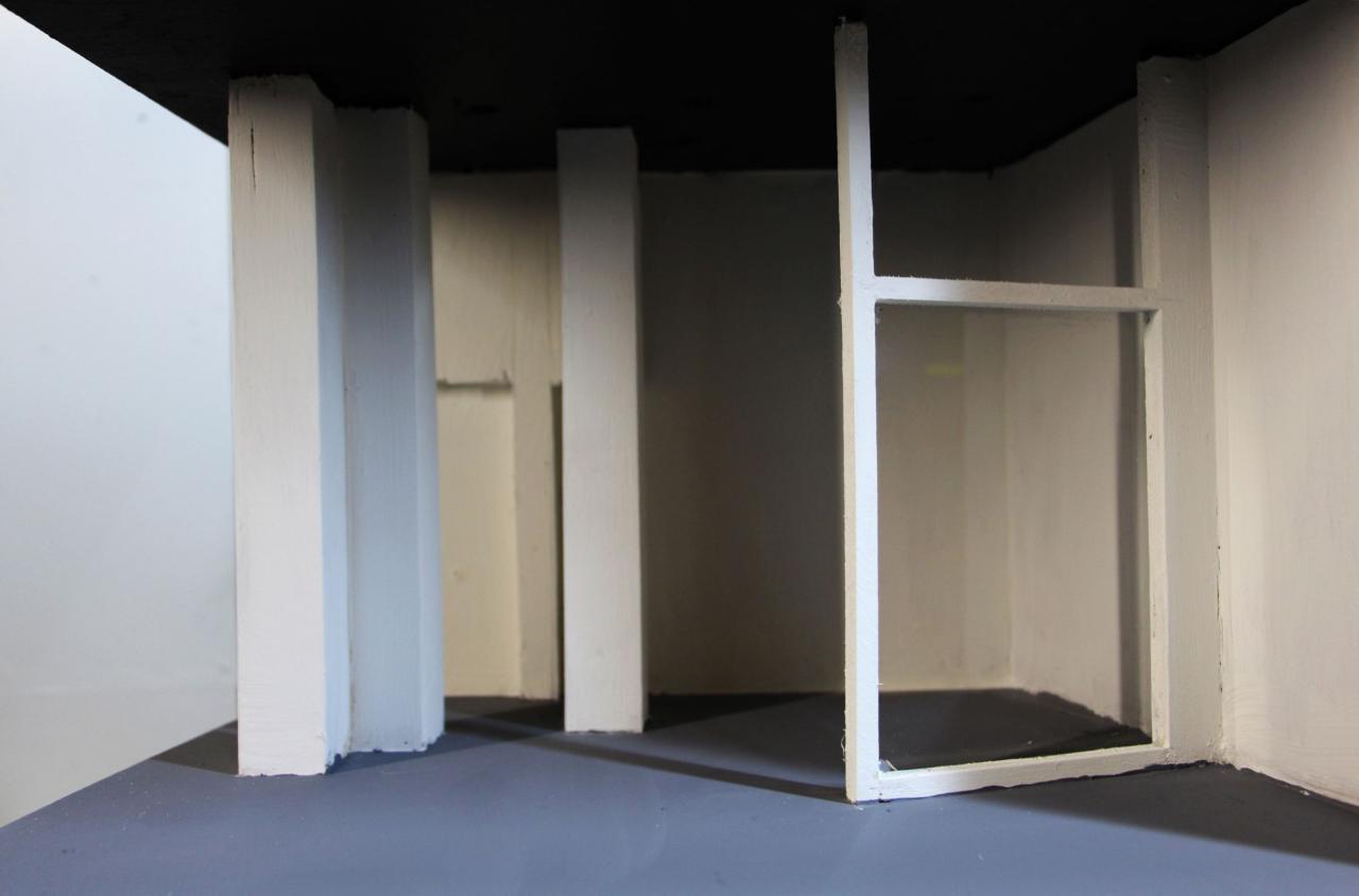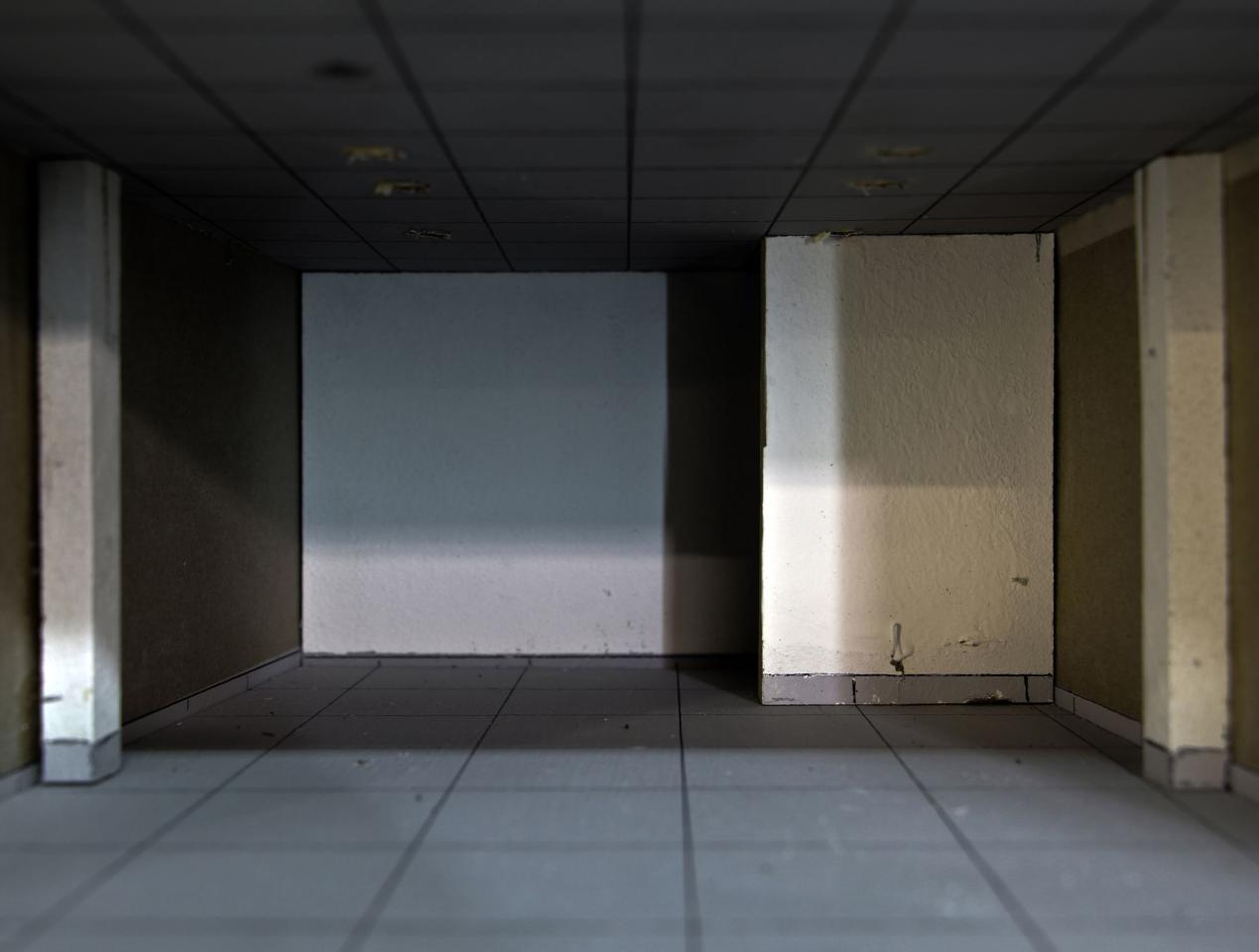 C’est depuis sa visite de la vitrine Crystal Palace vide, que l’artiste a débuté une recherche photographique et un travail de modélisation à partir de différents intérieurs commerciaux inoccupés, pour en définir certaines récurrences formalistes. Partant d’un vocabulaire spatial constitué de grilles, de murs, de vitres et de mobiliers, Rémi Groussin recompose l’intérieur d’une boutique dont la scénographie oscille entre espace commercial et mise en scène muséale. L’objet, le produit marchand, a totalement disparu. Seuls persistent des restes d’éléments spatiaux servant à sa promotion et à sa mise en lumière mercantile. Des images de modèles réduits imprimées à taille humaine viennent donner l’illusion d’une répétition en série, donnant des indications sur la nature même de ce supposé commerce. Cependant, chaque élément est précisément différent et c’est par les détails de leurs ressemblances et dissemblances qu’ils nous dépeignent un espace presque labyrinthique, à parcourir non pas physiquement mais mentalement. Agrandissements et mises en abîme constituent alors le décor abandonné d’un passé à redéfinir par une certaine forme de désenchantement que l’artiste désire ici rendre sculptural, troublant ainsi le regard du spectateur entre réalité et fiction.