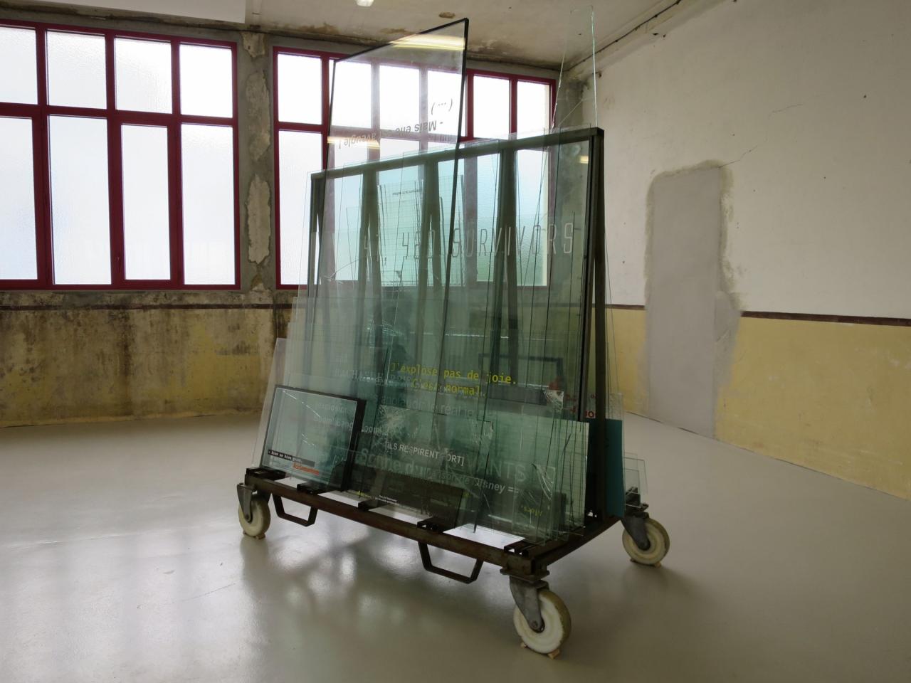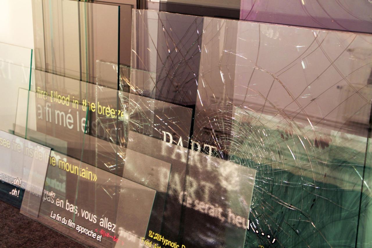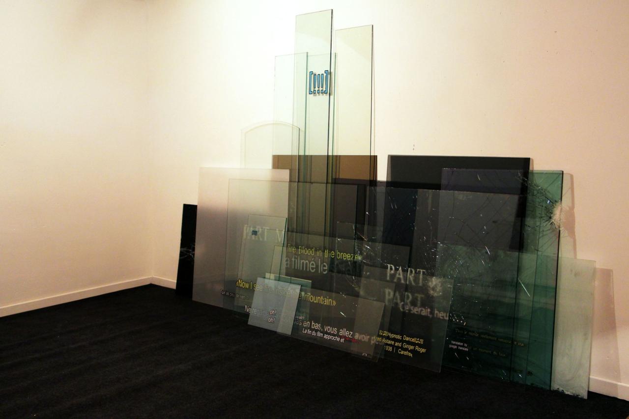 Vostfr, 2017, installation, subtitles on glass plates and mirrors, steel frame, 200 x 200 cm