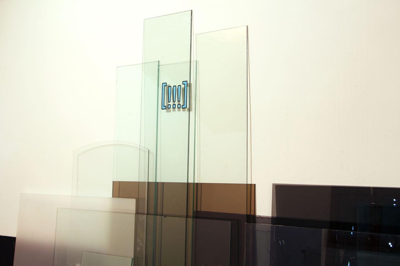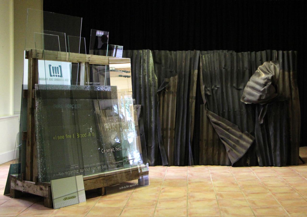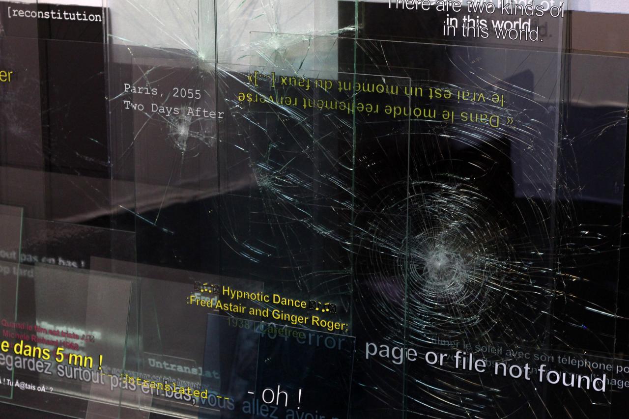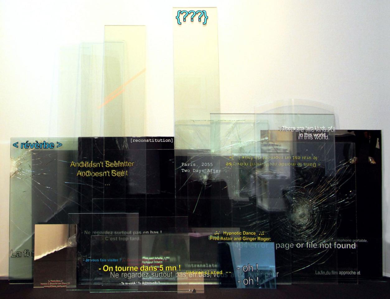 Vostfr, 2017, installation, subtitles on glass plates and mirrors, steel frame, 200 x 200 cm