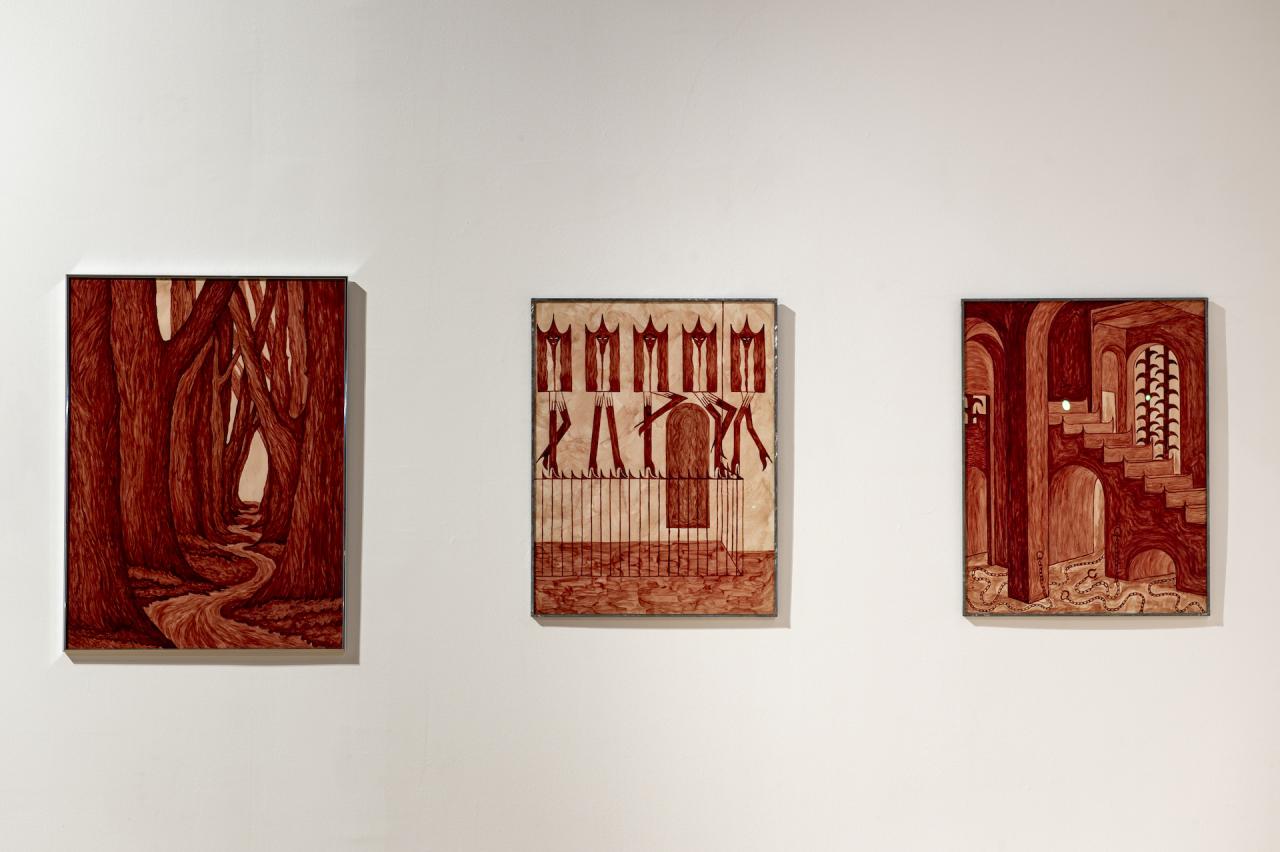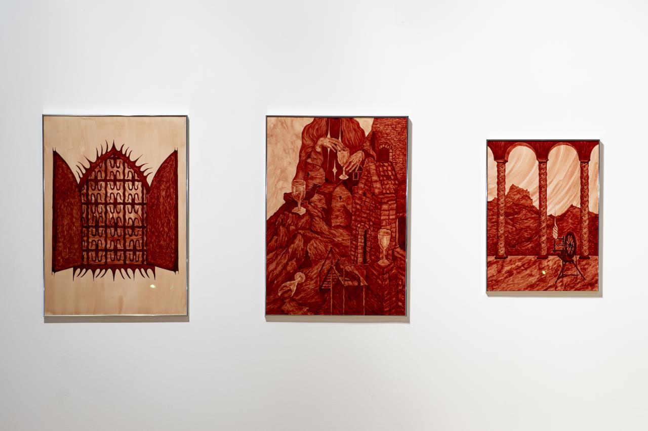 Fenêtre sur désolation, 2022, Sang humain sur papier, Amertume de l’ivresse, 2022, Sang humain sur papier, Le filage des montagnes, 2022, Sang humain sur papier, vue de l’exposition collective Mezzanine Sud – Prix des Amis des Abattoirs, 2022, Les Abattoirs, Musée – Frac Occitanie Toulouse, Toulouse, détail, photo Franck Alix