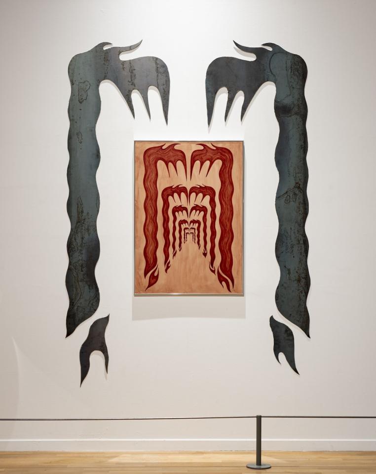 Crépuscule, 2022, Sang humain sur papier, Les filles du club, 2021, Sang humain sur papier, Espanta Bruixes, 2021, Sang humain sur papier, vue de l’exposition collective Mezzanine Sud – Prix des Amis des Abattoirs, 2022, Les Abattoirs, Musée – Frac Occitanie Toulouse, Toulouse, détail, photo Franck Alix