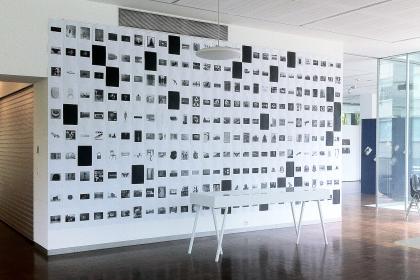 Un atlas n’existe pas, en effet, sans un dispositif formel et matériel permettant de mettre les images en coprésence et d’organiser leur fonctionnement en tant que corpus. Pour Warburg, par exemple, le dispositif fut les écrans de tissu noir installés dans sa bibliothèque et permettant les multiples combinaisons et agencements d’images dans cet espace donné.