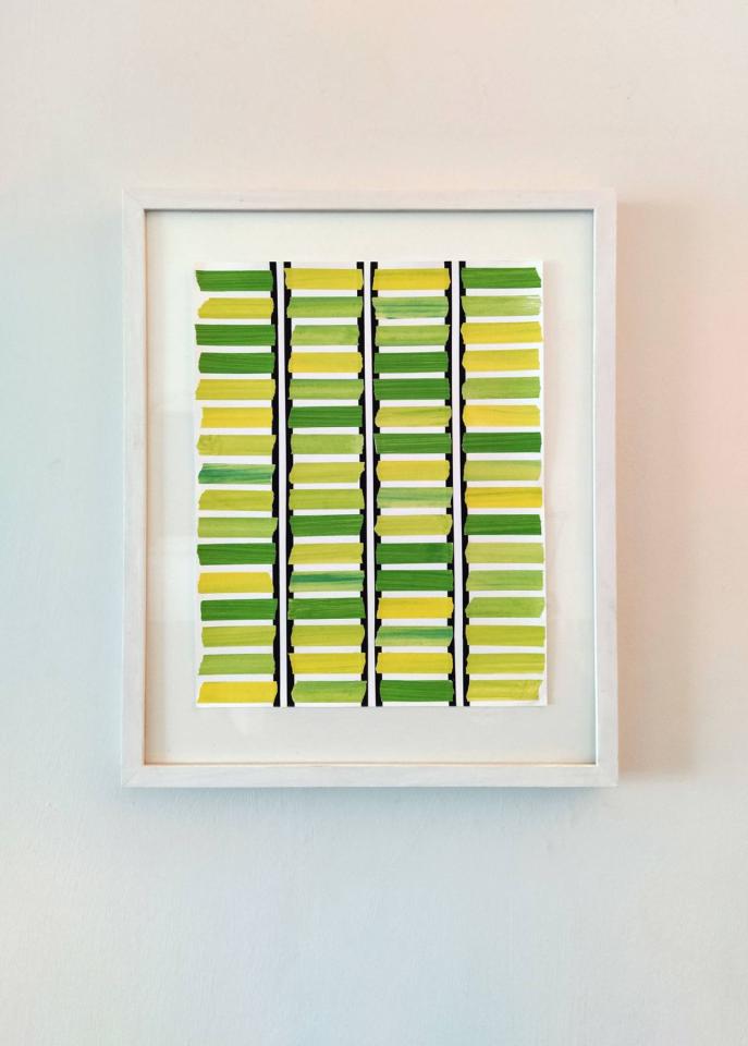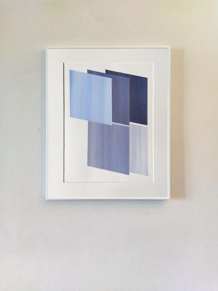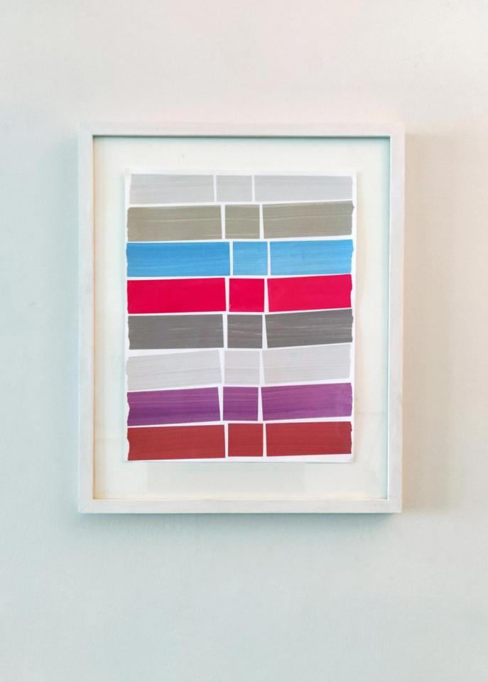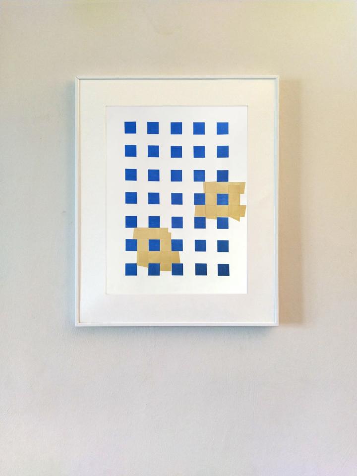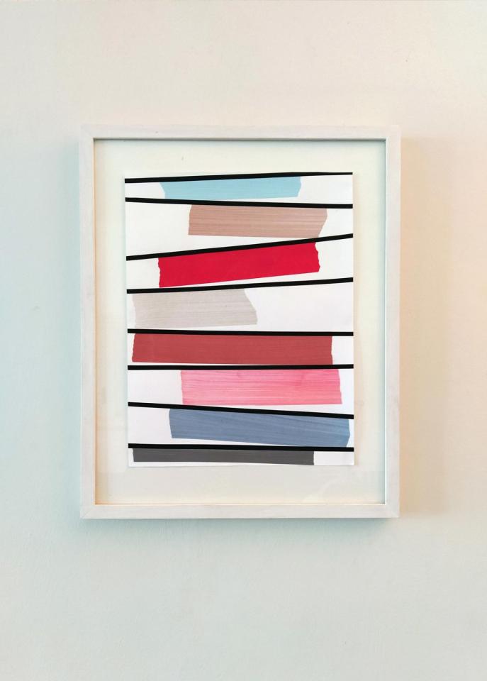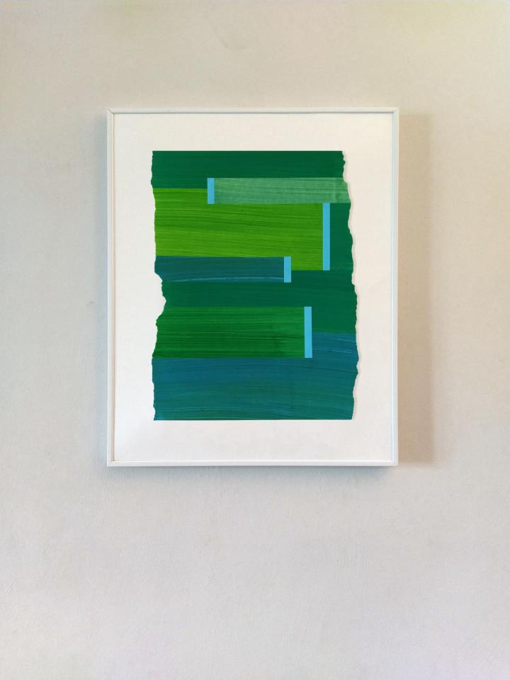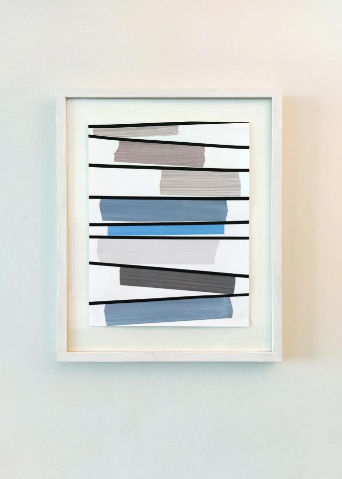 Mes réalisations de collages de papiers gouachés se déploient en séries construites sur une grille de lignes horizontales et verticales structurant la surface.