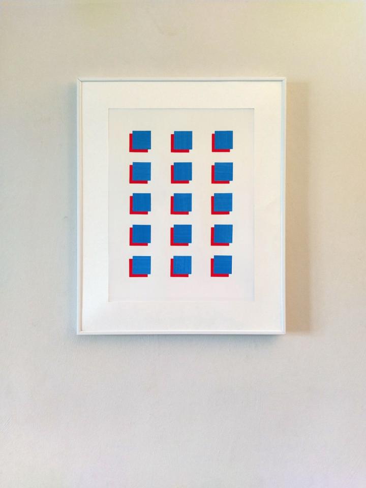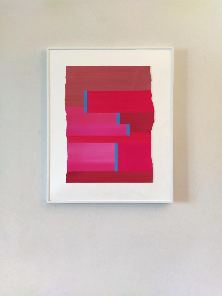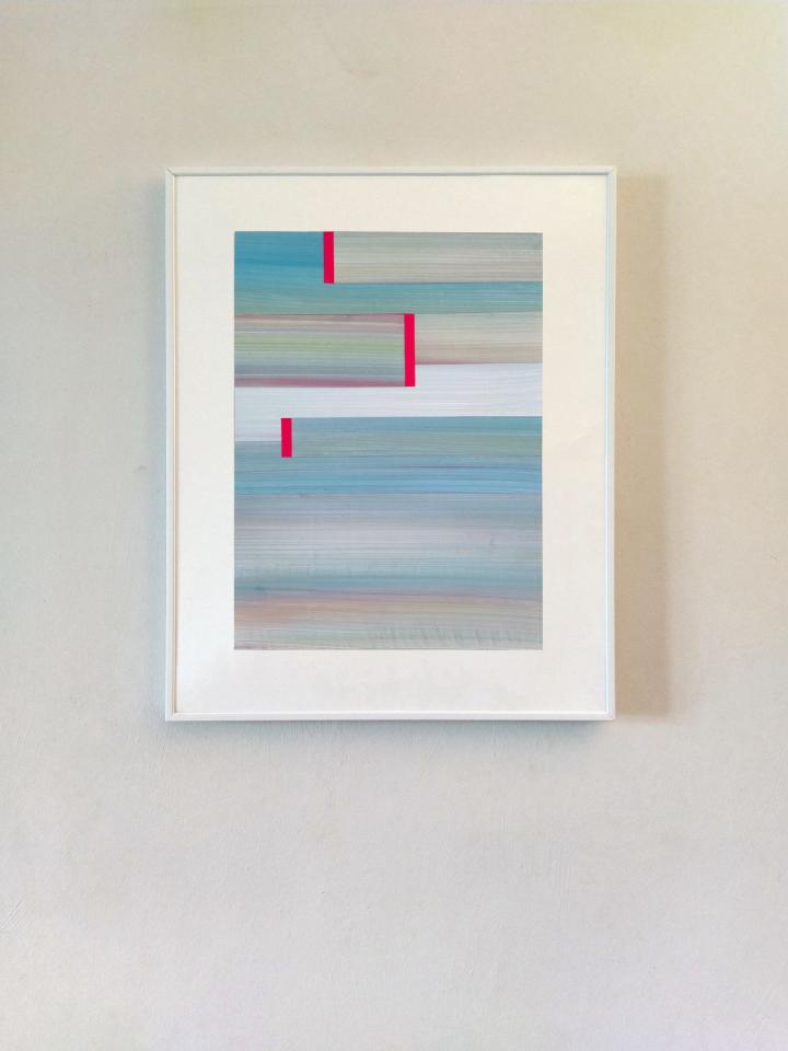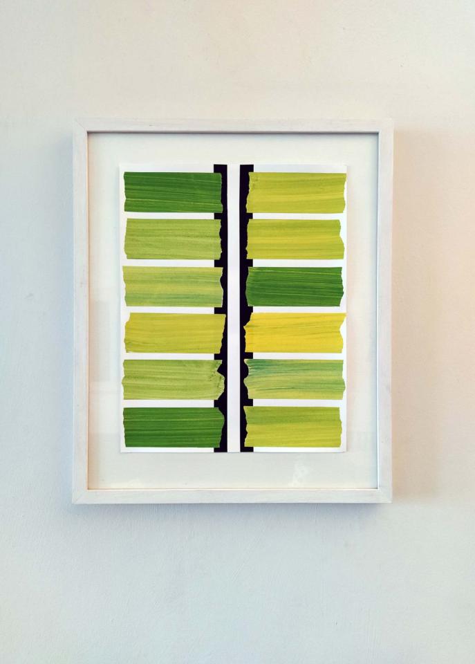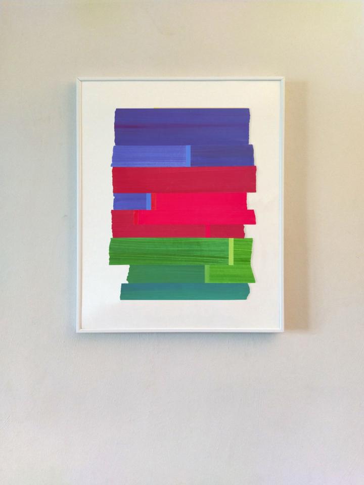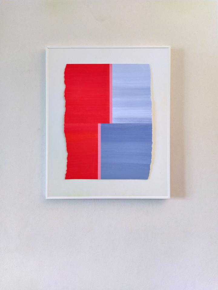 Mes réalisations de collages de papiers gouachés se déploient en séries construites sur une grille de lignes horizontales et verticales structurant la surface.