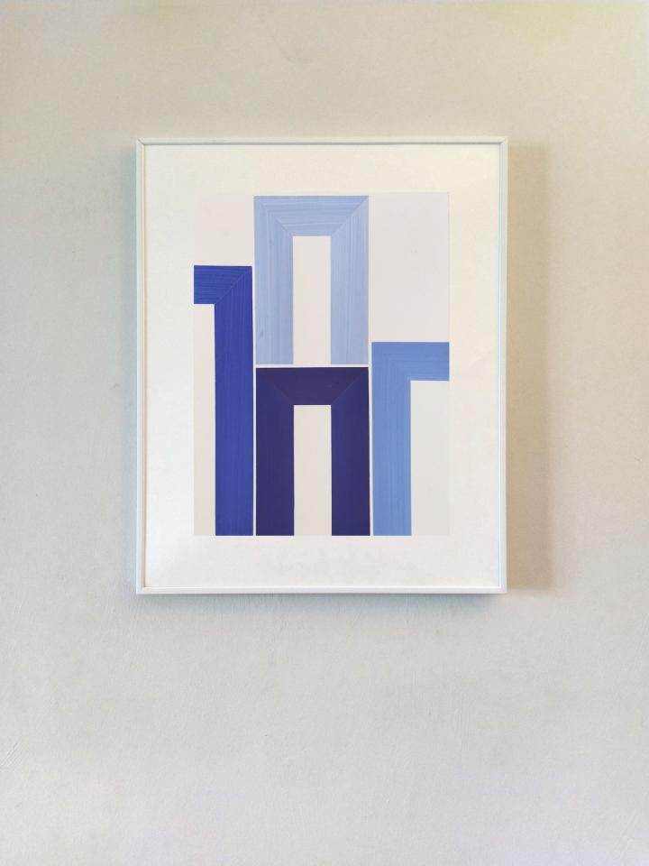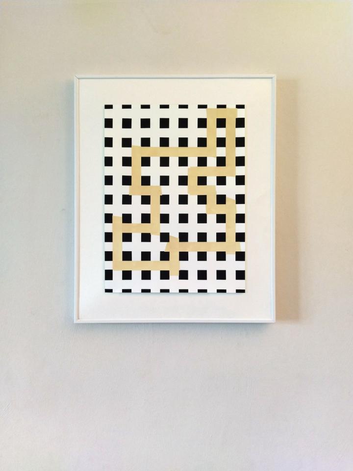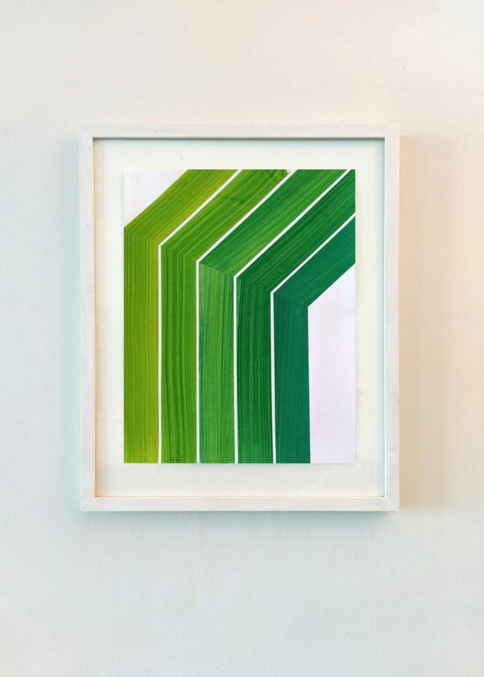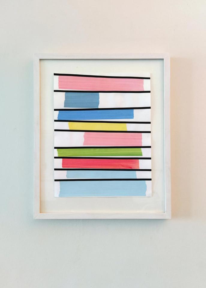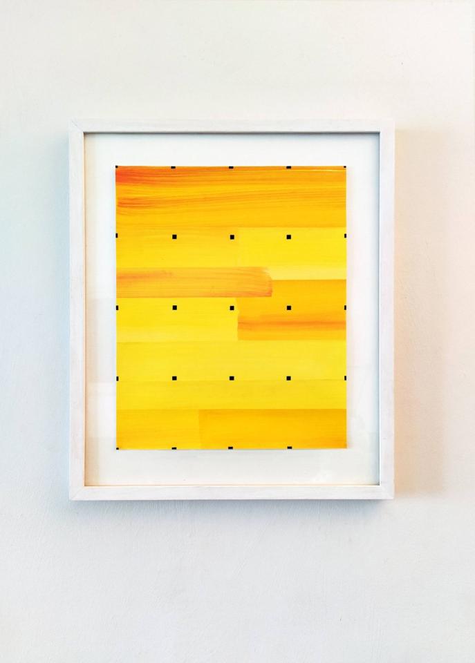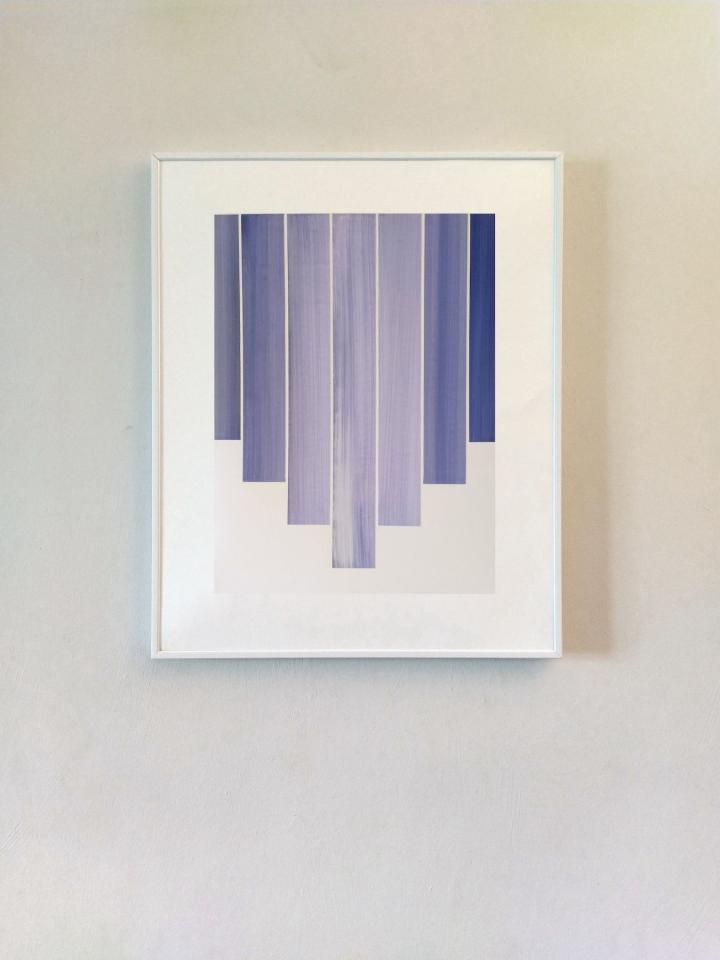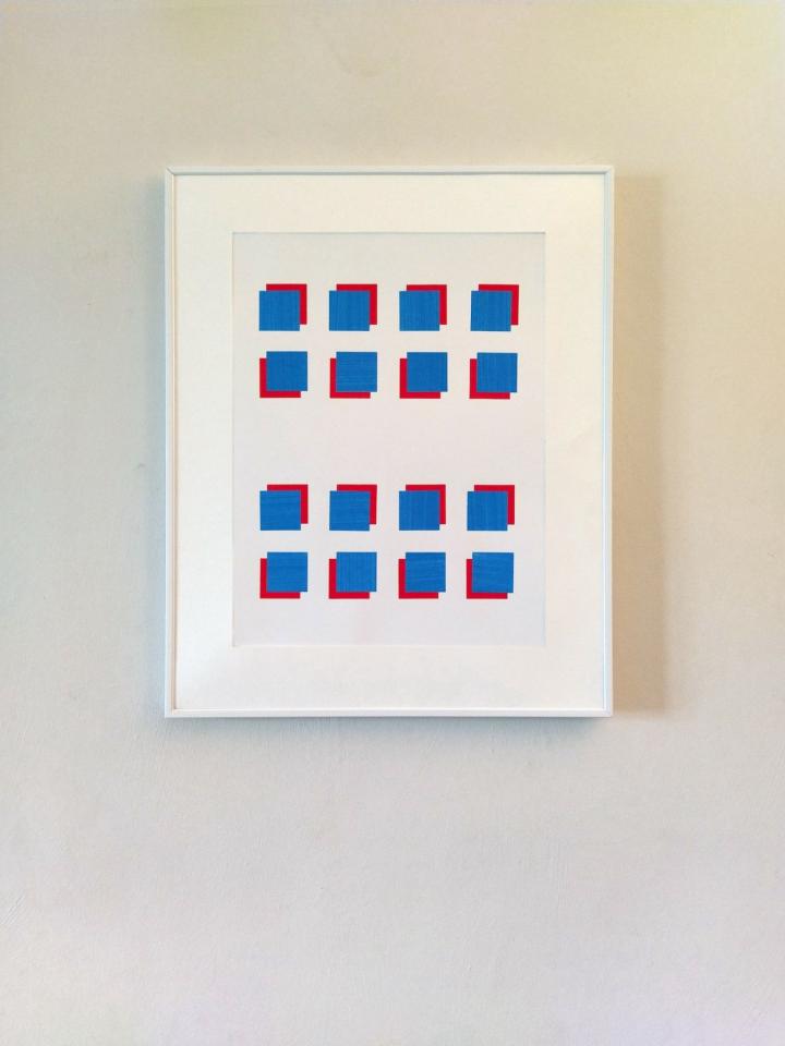 Mes réalisations de collages de papiers gouachés se déploient en séries construites sur une grille de lignes horizontales et verticales structurant la surface.