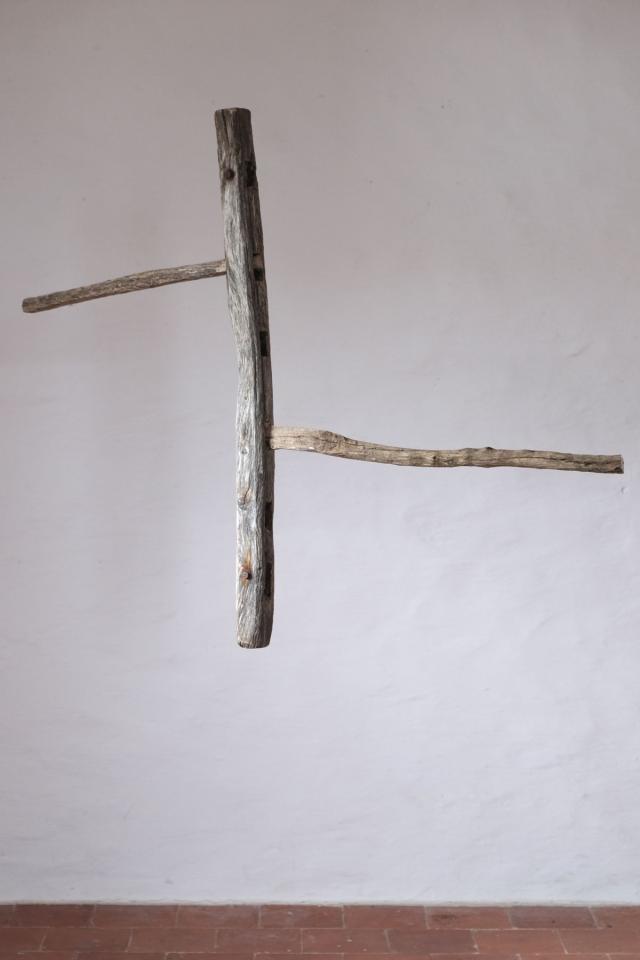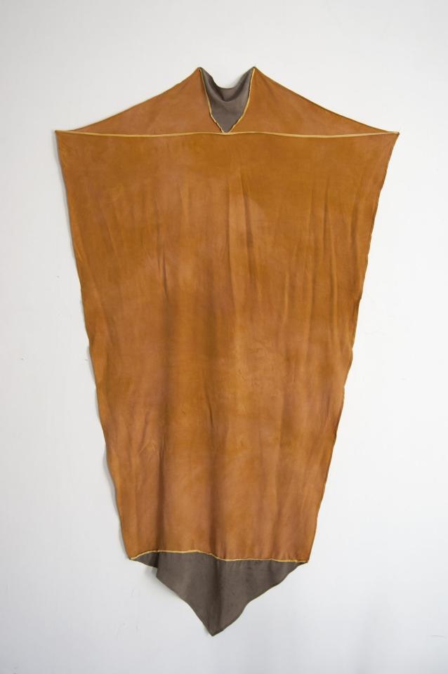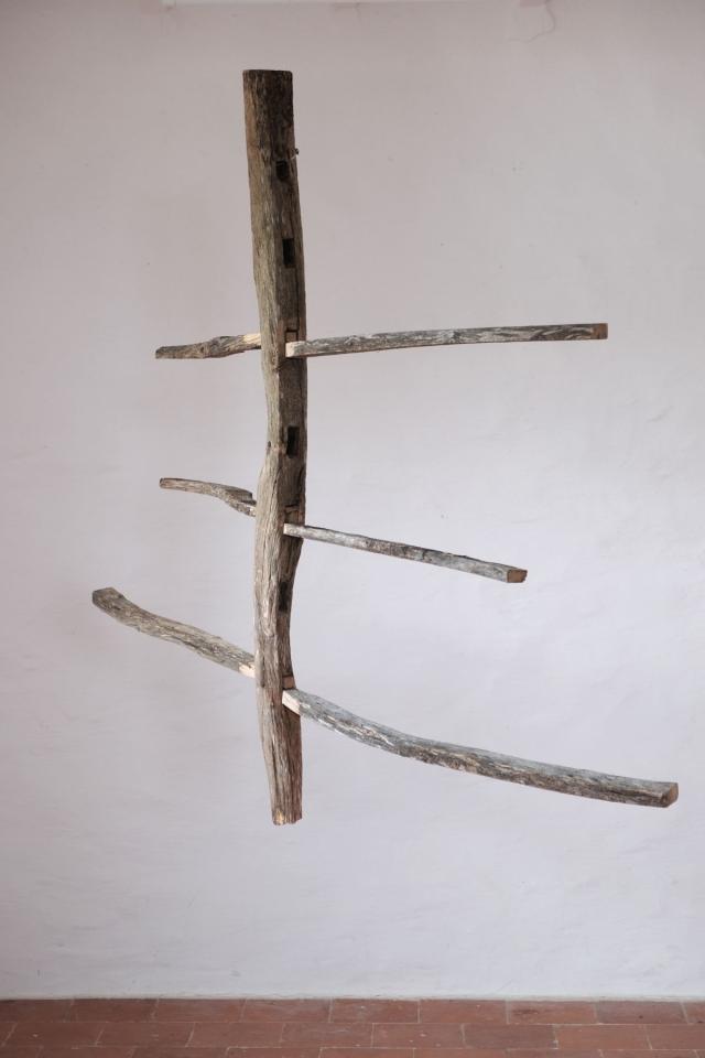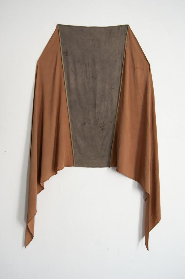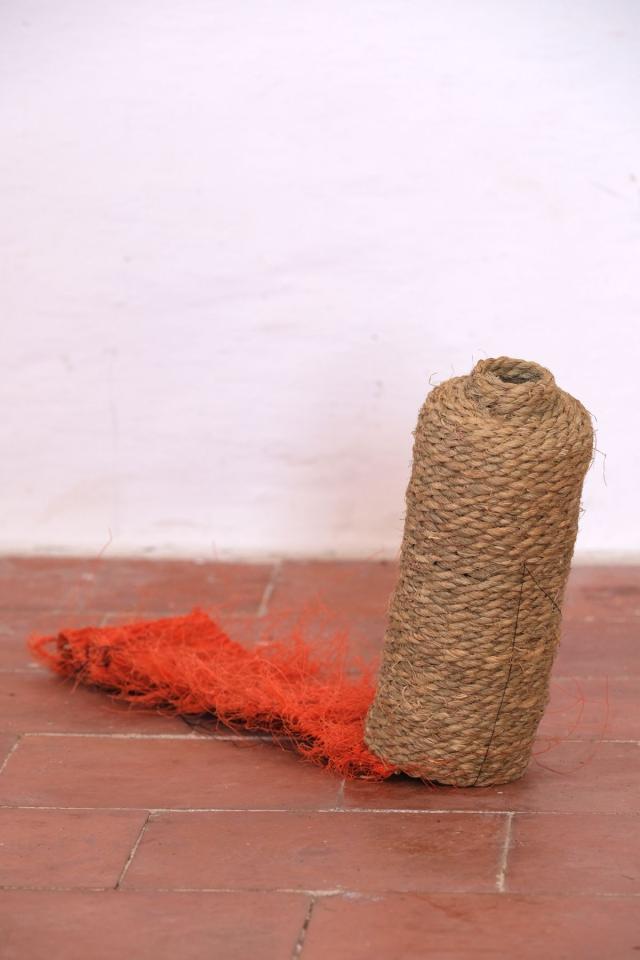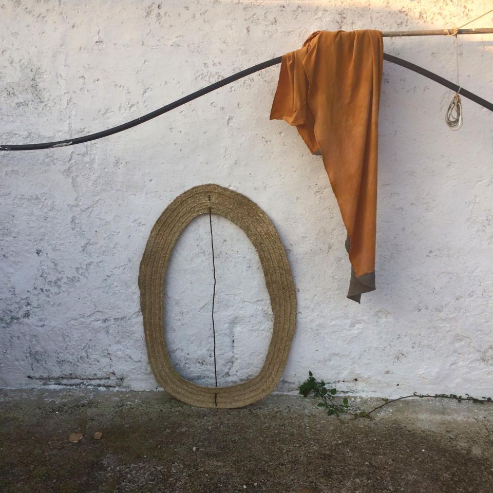 Idiolecte, 2020, plâtre, alfa, bois d’olivier sauvage, cuir, cordages synthétiques, teintures végétales, soie, fer, pierre
