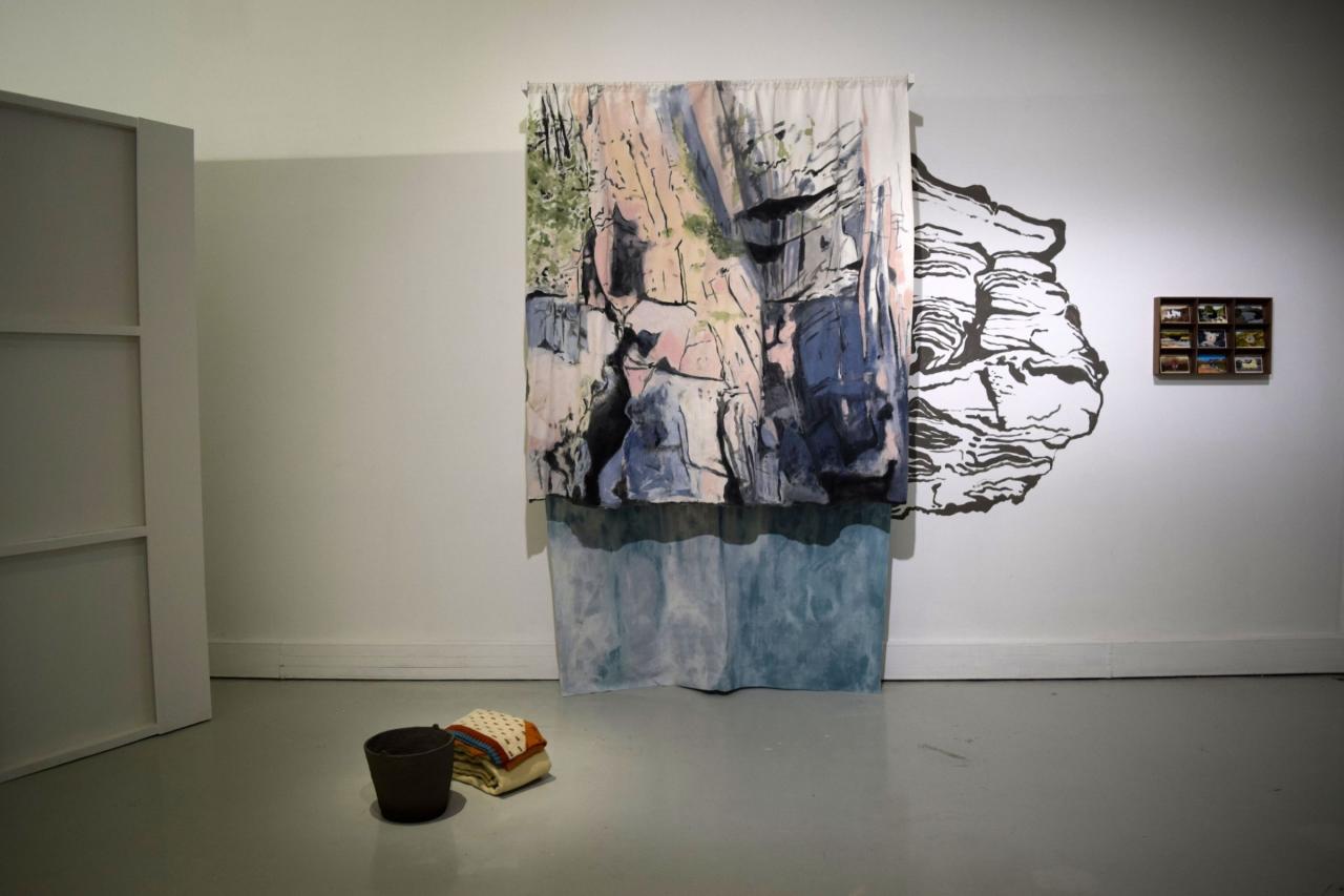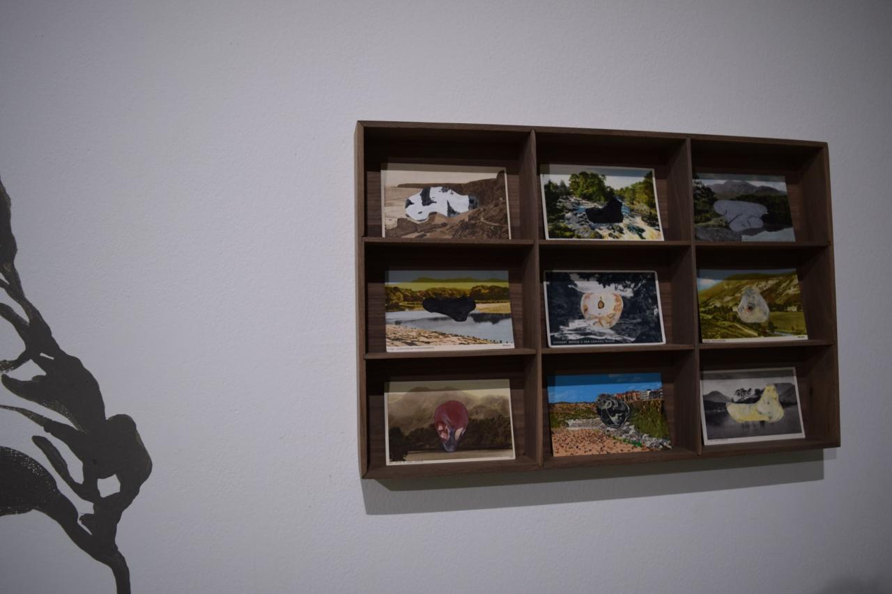 Scenery, 2020, argile, terre crue, laine, peinture, coton, cartes postales, gouache, noyer