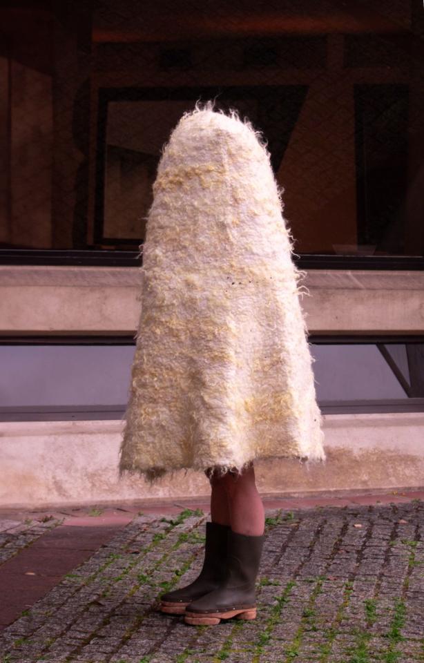 Seulette, 2025, performance, laine feutrée, caoutchouc, noyer, clous, son