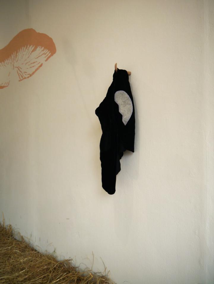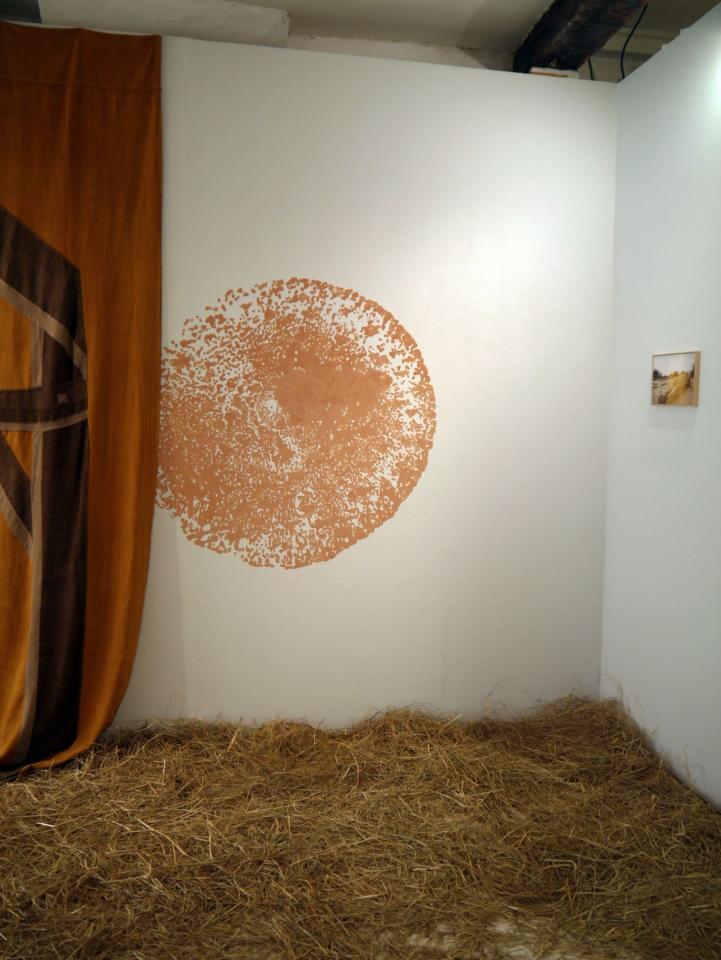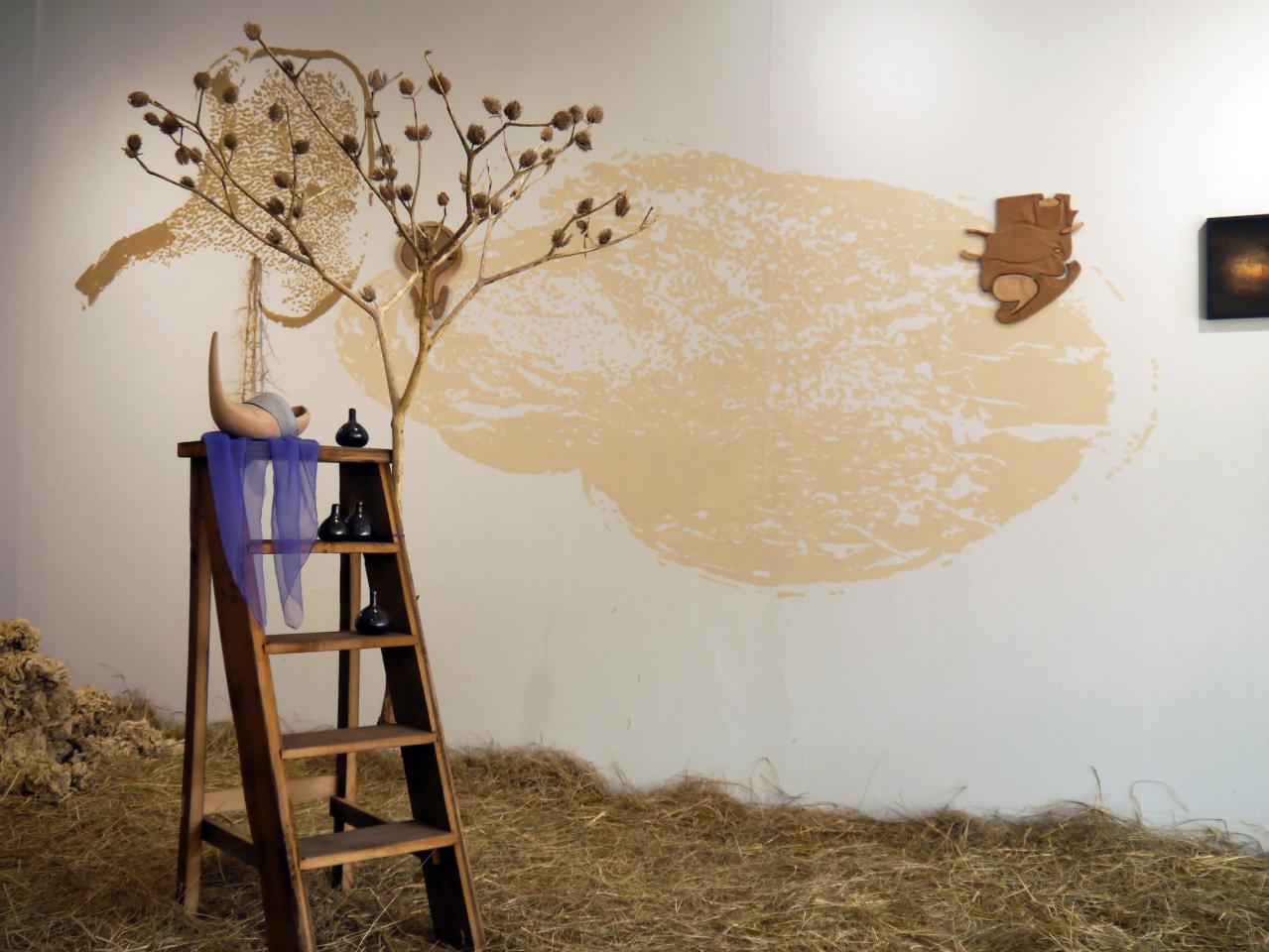 Verre soufflé, grisaille et sels d’argent sous verre, argile, laine, coton, zinc, bouleau, châtaigner, grès cuit au bois, terre cuite, datura, cardère, coton, teinture végétale, foin, photographie argentique