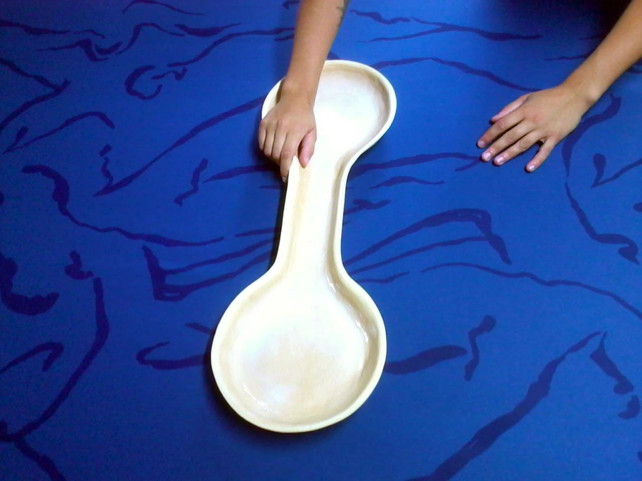 Célie Falières, Courant Sagittal, 2018, performance, 30 assiettes de grès émaillées, 25 mètres de nappe sérigraphiée