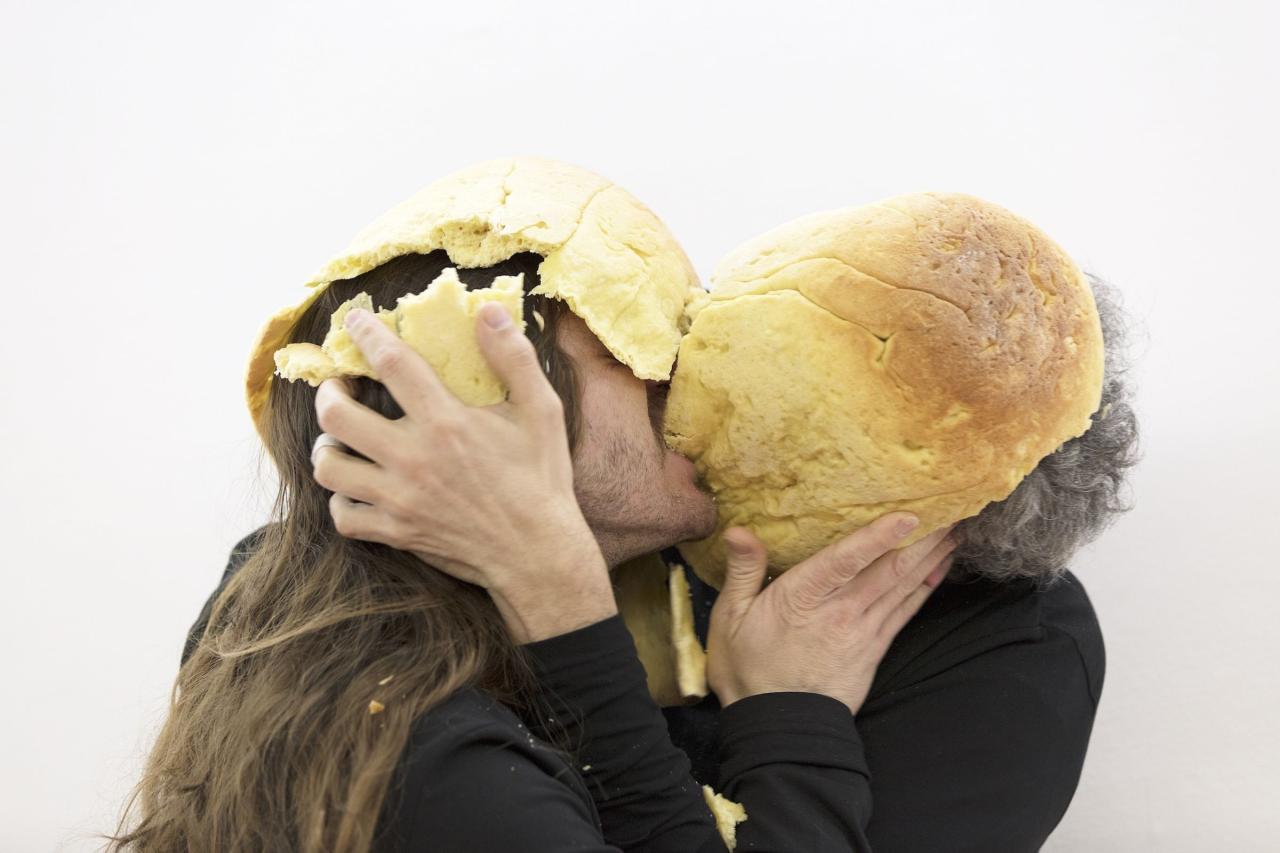 Affublé·es d’un masque en matière tendre et moelleuse, deux personnages se dévorent l’un l’autre le temps d’une chanson d’amour perdu. Une performance cannibale saveur levain, qui n’est pas sans évoquer la temporalité des relations : jusqu’où pouvons-nous dévorer les autres ? Ce n’est qu’après avoir dévoré la majeure partie de ce casque-brioche, que le visage de chaqu’unx se révèle à l’autre. Manger ensemble est une chorégraphie qui démasque. Des bruits de bouche aux fluides qui dégoulinent sur les doigts ou aux coins des lèvres, du dégoût à la sensualité, le langage de la becquetance et celui du désir se rencontrent à bien des égards. Je te dévore du regard.
