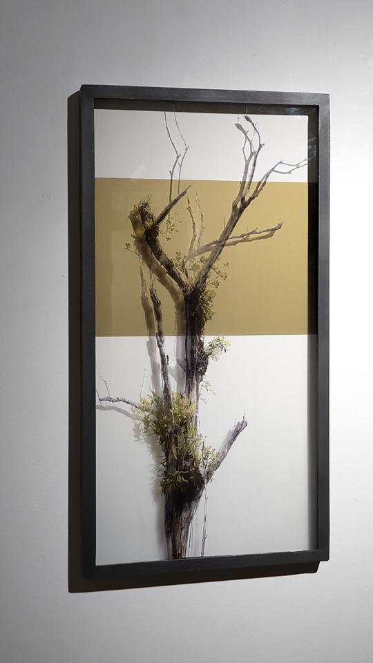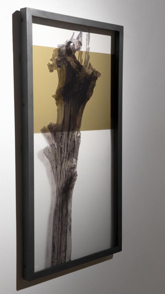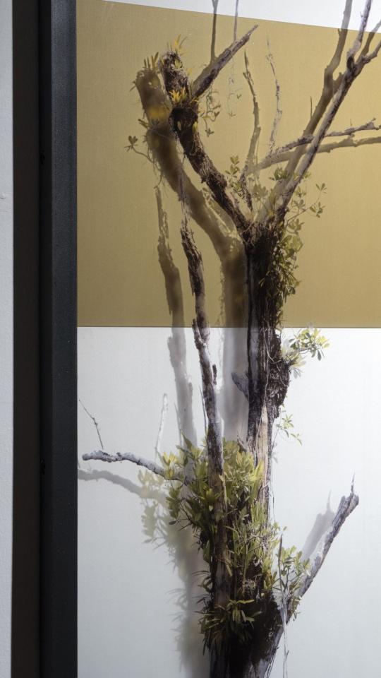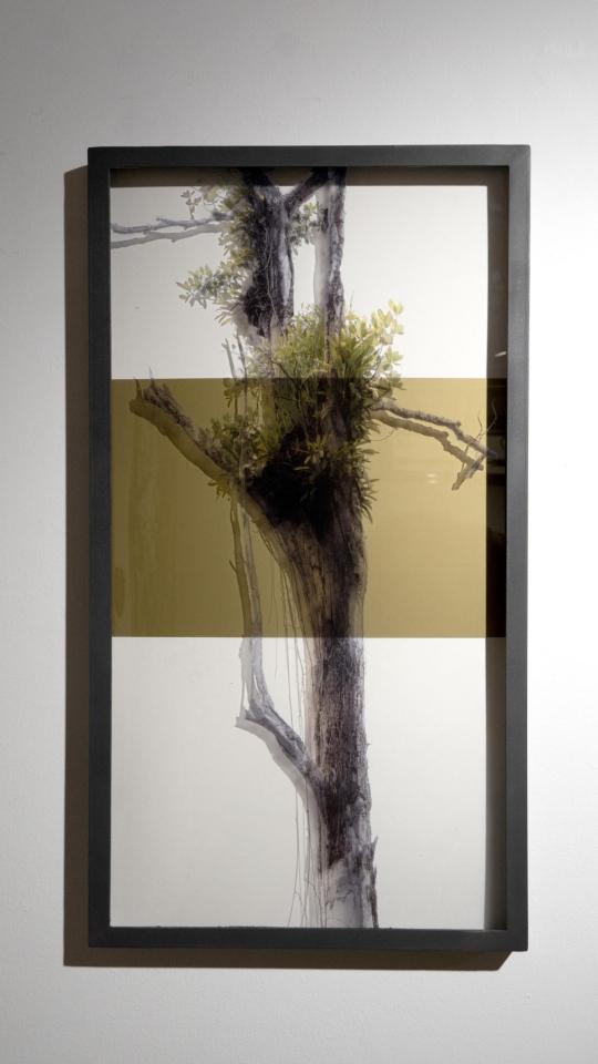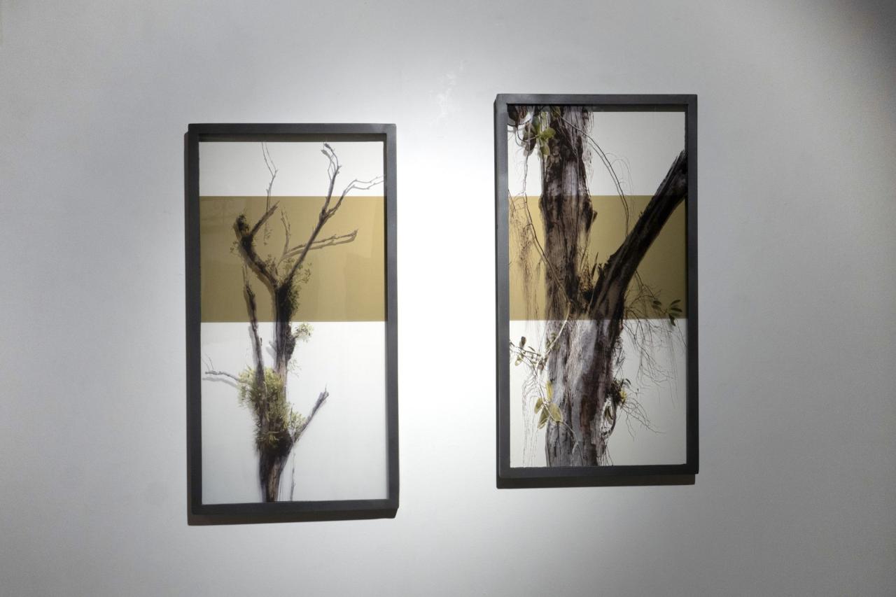 La forêt d’arbres morts du Lac de Petit Saut en Guyane accueille sur ces cimes des plantes épiphytes qui viennent chercher refuge. La photographie, silencieuse et frontale, capte ce qui, à première vue, semble déserté ou muet, voire vide. Dans un lien entre matière et image, l’impression sur verre trouble la lecture en révélant et effaçant ce paysage porteur de récits.