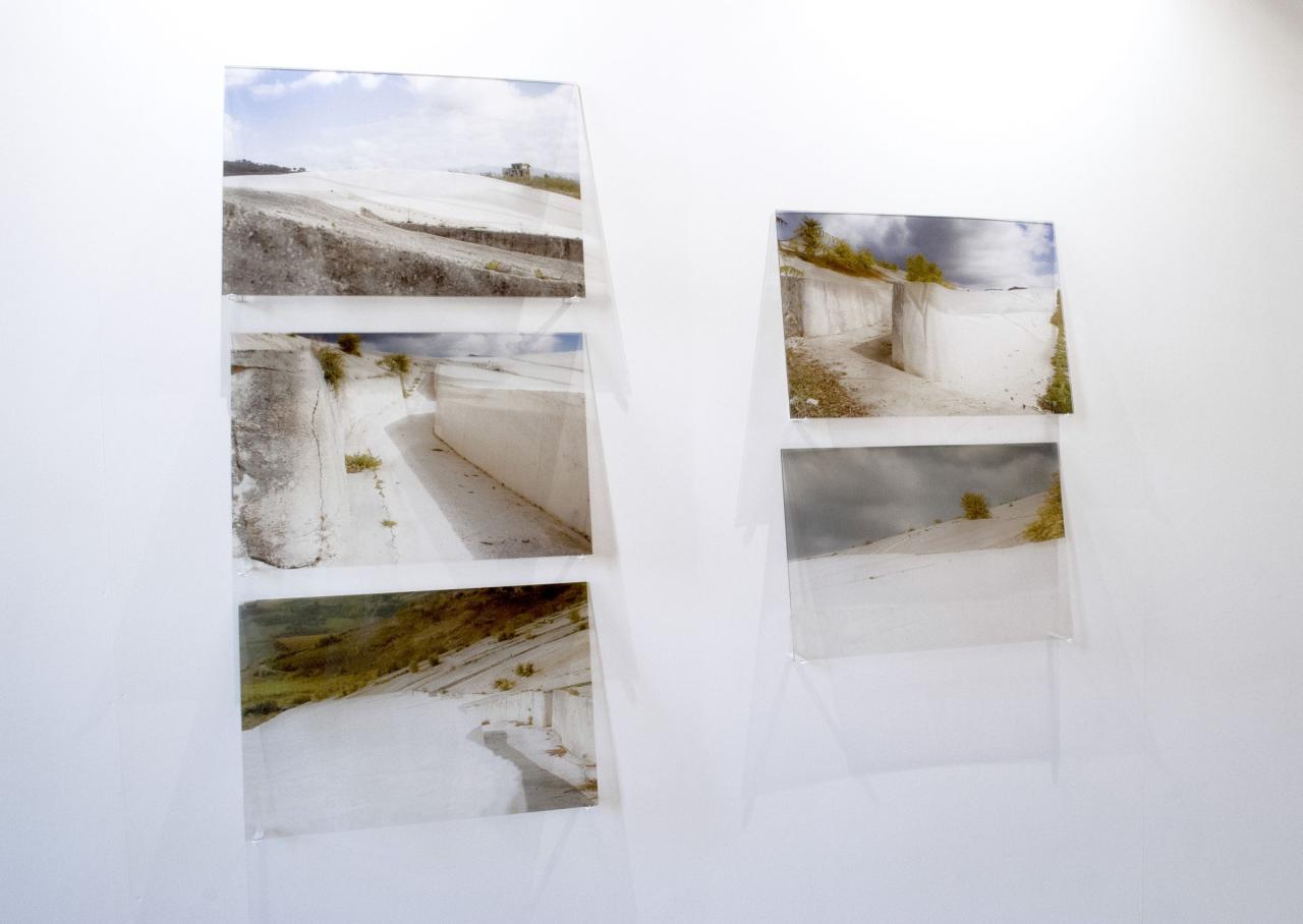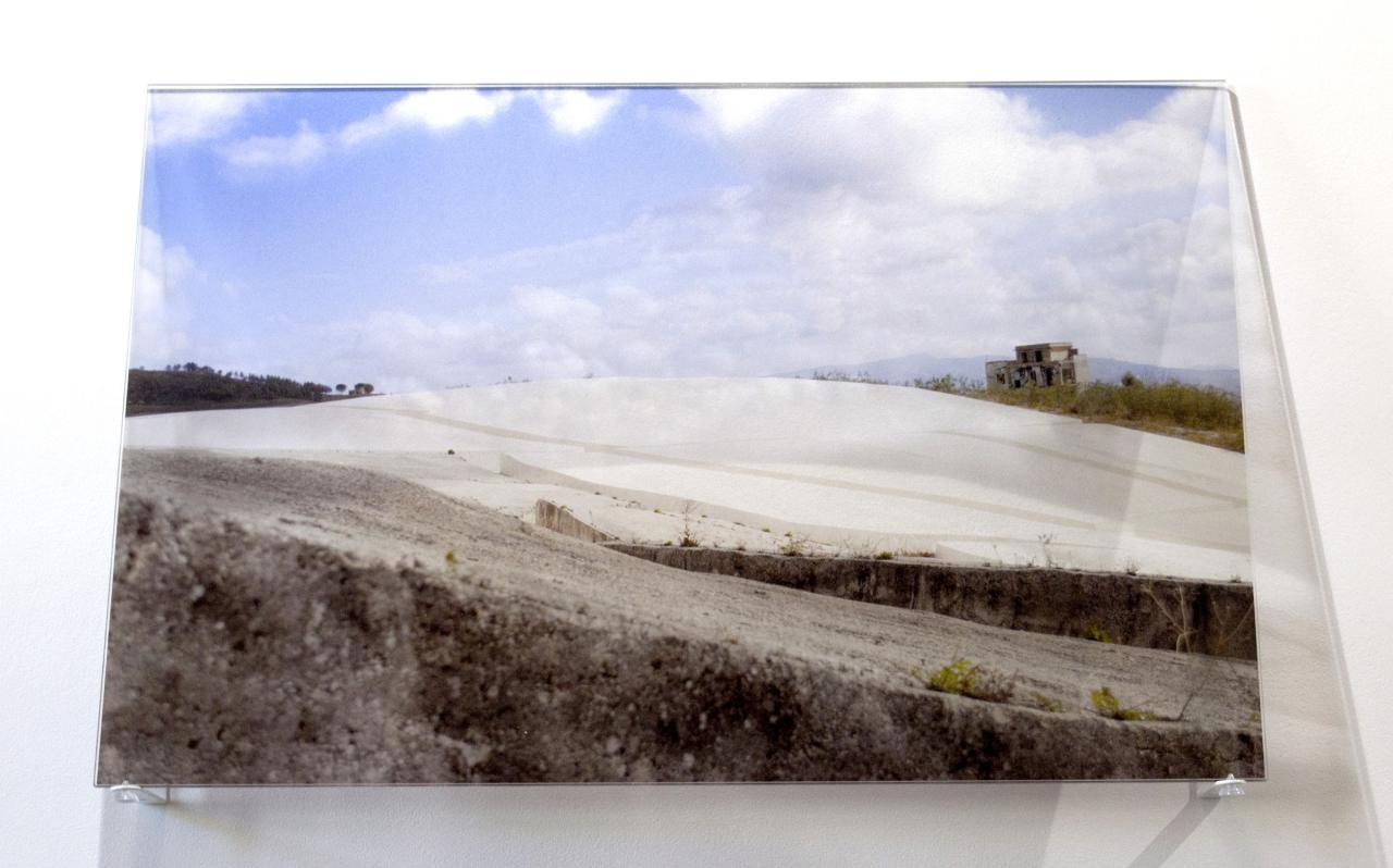 À deux reprises Éléna Salah s’est rendue sur le site du Cretto en Sicile. La première fois, elle a trouvé un paysage en ciment réalisé par Alberto Burri, brut, inachevé, abandonné et superposé à la ville ensevelie. Dix ans plus tard, elle sait que le labyrinthe de béton a été complété conformément au projet initial. Deux zones apparaissent distinctement, celle sous laquelle sont enfouis les restes de la cité et de ses habitants, patinée par le temps et mitée par une nature qui reprend ses droits, et l’autre, pur artefact d’un blanc immaculé et aveuglant sous ce soleil de plomb.