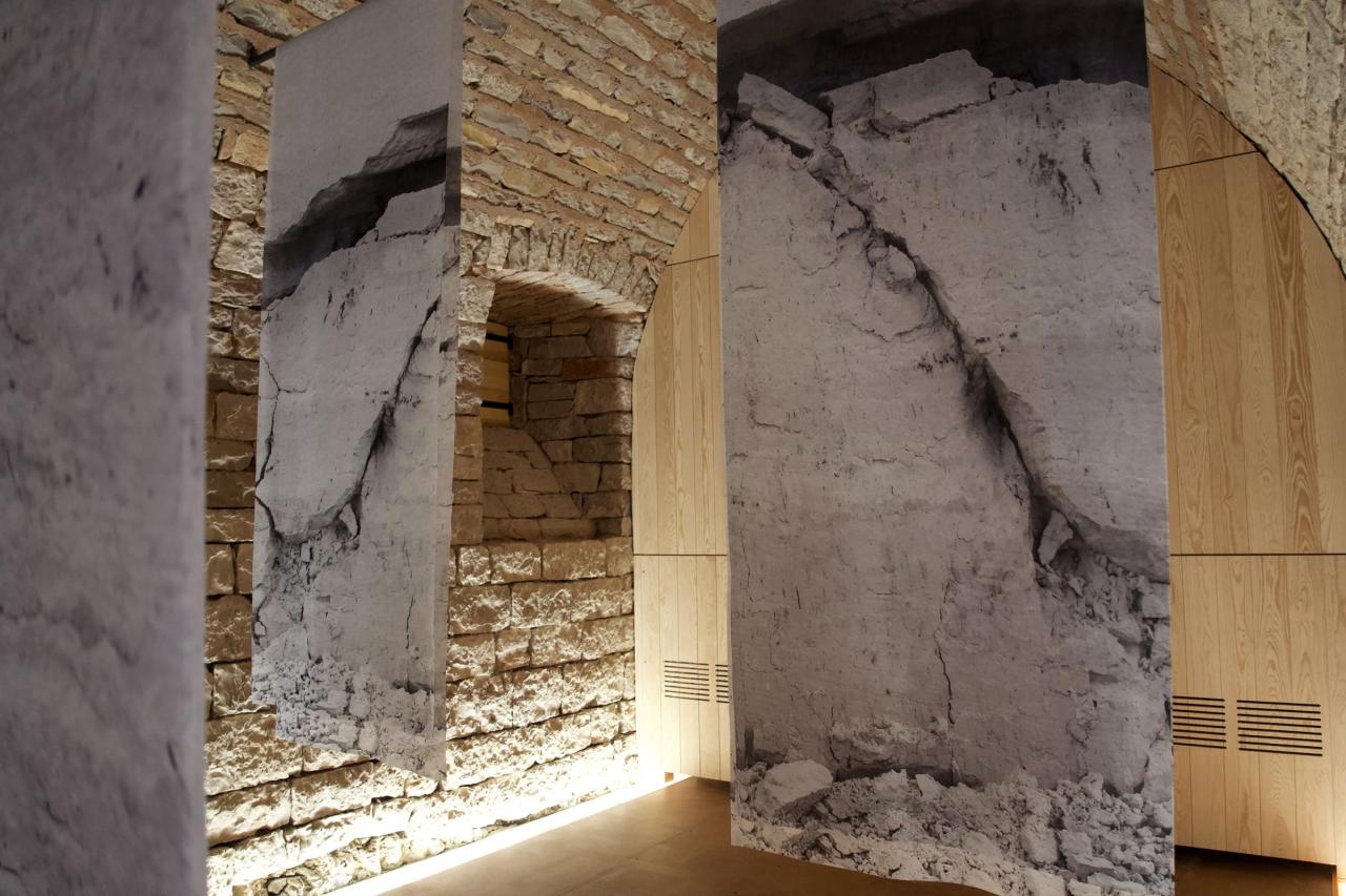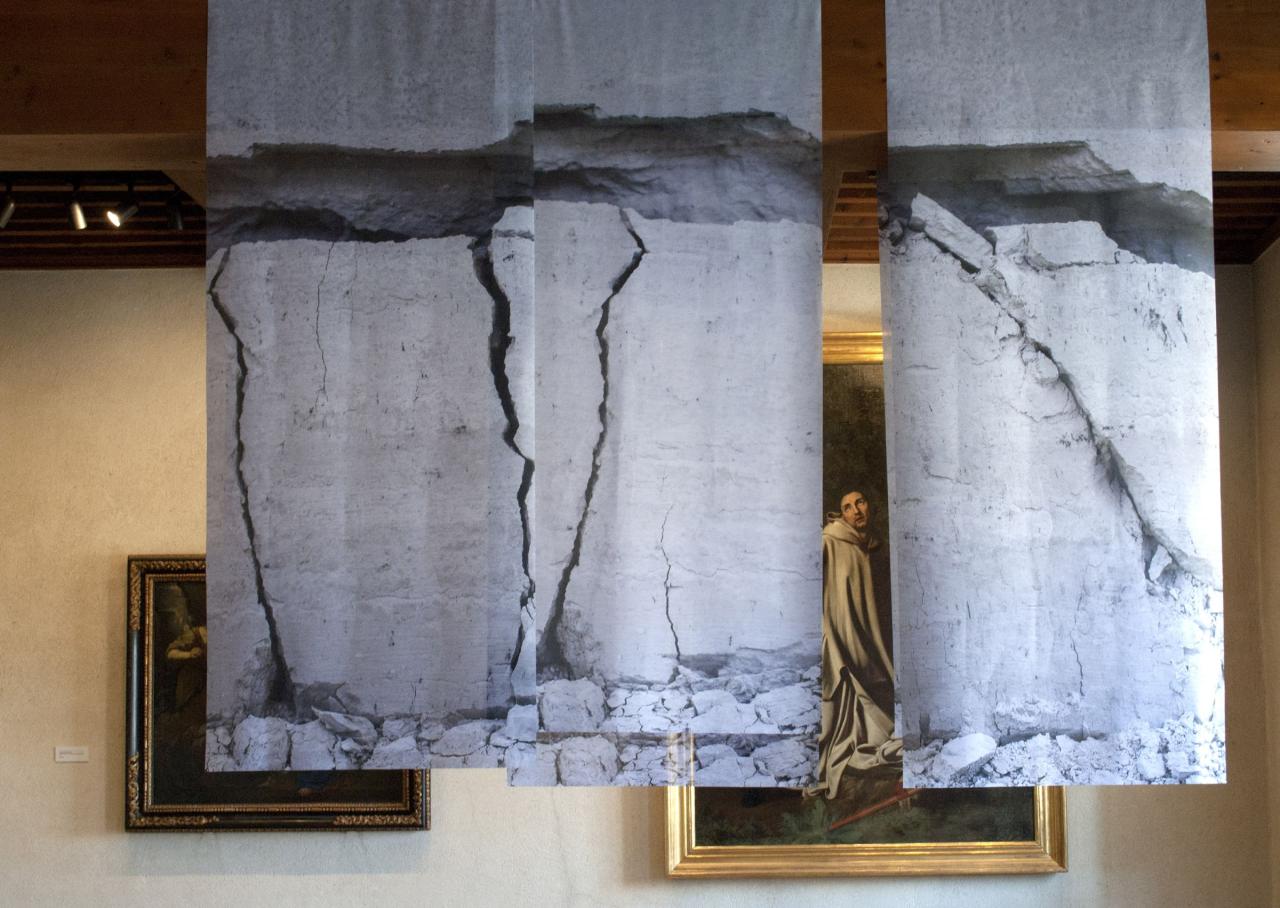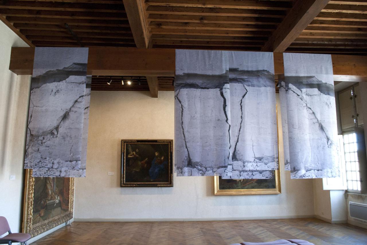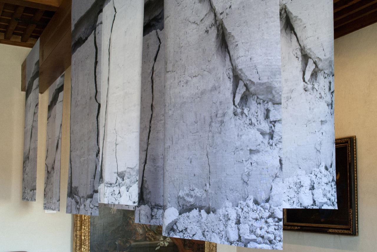 L’image fragmentée est reconstituée par l’installation qui expose une dimension de l’effondrement. Suspendues, les roches prétendent rendre leur volume par la transparence et la superposition. L’installation fait écho aux drapés des peintures et aux bannières suspendues. La légèreté des tissus noirs et blancs se confronte à l’architecture.