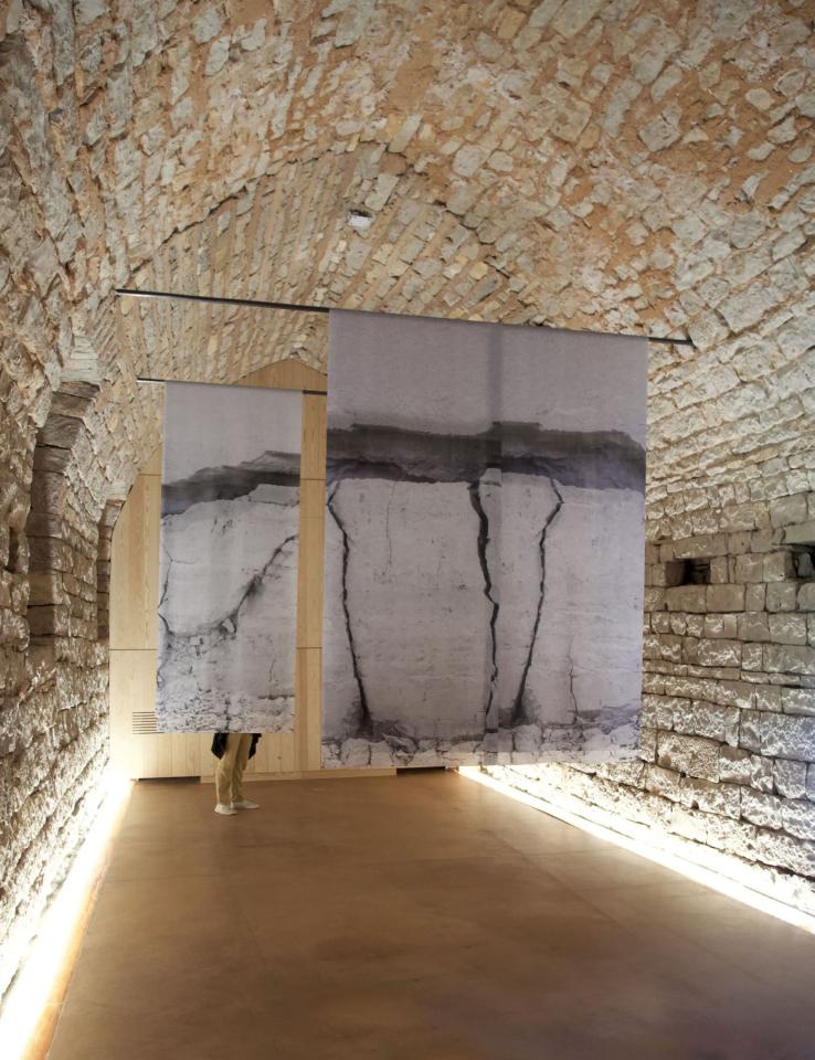 Le Couronnement des Falaises, 2020, installation in situ, tirages sur tissus drapeau, 250 x 500 x 50 cm, vue de l’exposition personnelle La Résilience des Lieux, Musée Pierre-de-Luxembourg, Villeneuve-lez-Avignon, commissariat Céline Mélissent, détail