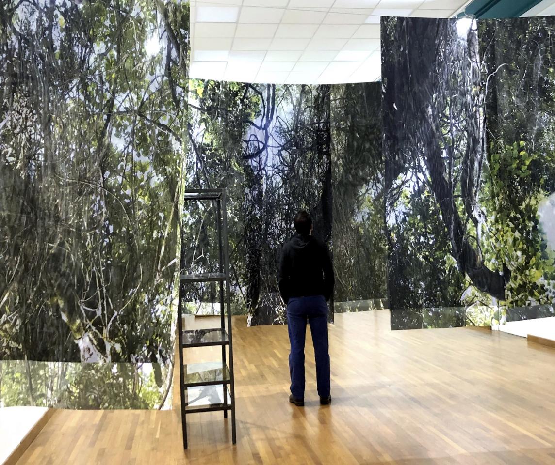 Pour rendre compte des traumatismes paysagers en Guyane, elle a pris en photo ces arbres asphyxiés par les lianes qui meurent et qui finissent par s’effondrer, ouvrant la forêt à la lumière : “J’ai fragmenté la photo et je l’ai imprimée sur plusieurs laies de tissus”. Le fait de fragmenter, de suspendre les laies sur un fil à travers la pièce, contribue à rendre compte de cette notion de “traumatisme paysager”: comme l’arbre et la forêt, l’image est construite et déconstruite.