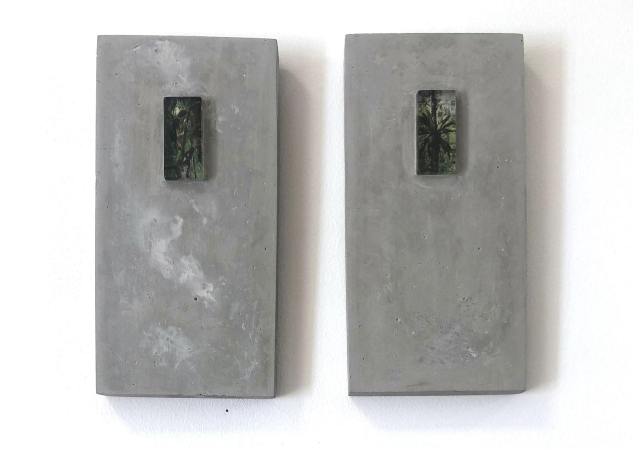 Éléna Salah, Herbier, 2022, série, tirages transférés sous résine et incrustés dans du ciment, 20 x 12 x 2 cm chacun