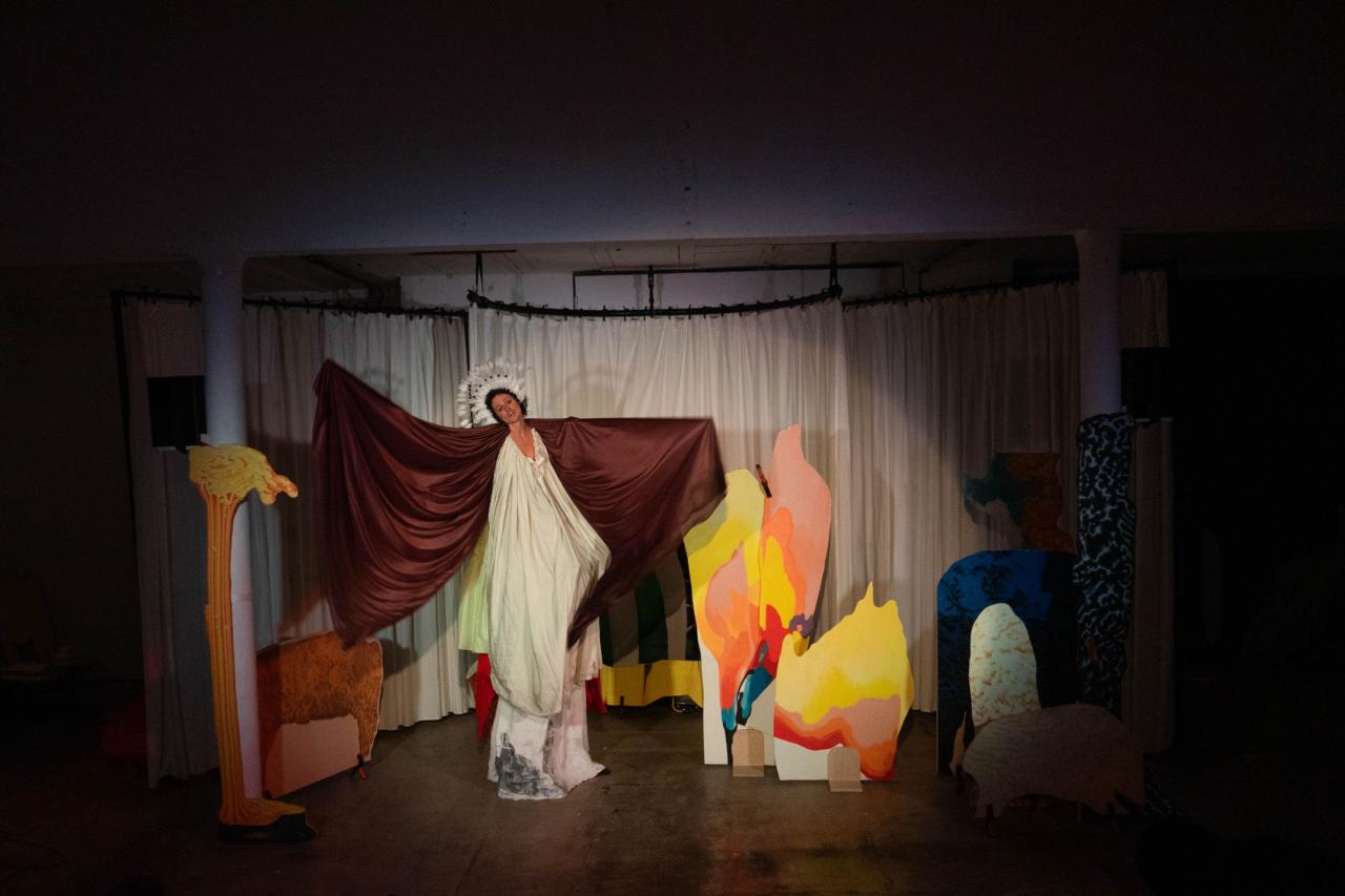 Il y a du bas-relief, de l’ornement de vases grecs, des grands espaces américains, des grandes dames et des magiciennes de music hall, Bérénice et Titus, de la country musique, les moines d’un culte onirique, un troupeau, du night club berlinois, du feu, du playback, un équidé violet, de l’expressionnisme allemand, un micro néon, un personnage en slime blanc, des lasers, une scie sauteuse sculptrice, une poursuite vivante, de l’eau, un cow-boy poussiéreux en mousse, un strip-tease équestre au chocolat, des souliers et un micro en plâtre, de la cybernétique, du javanais, des collerettes en veux tu en voilà, une Pythie, de la grande chanson italienne, du Bluetooth, de grands nettoyages, Loïe Fuller peut-être, Barbara certainement…