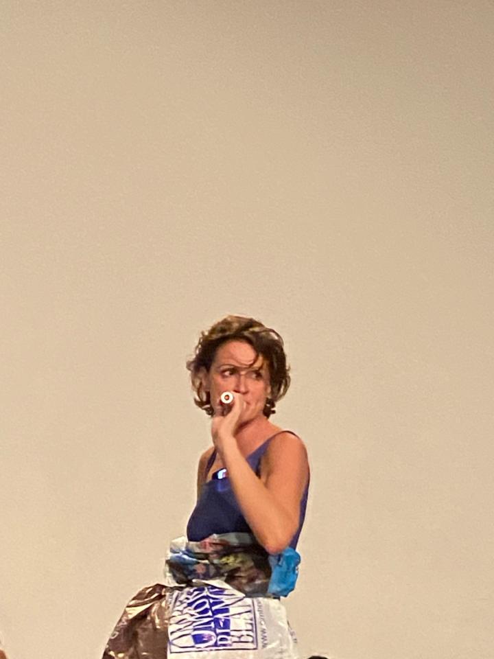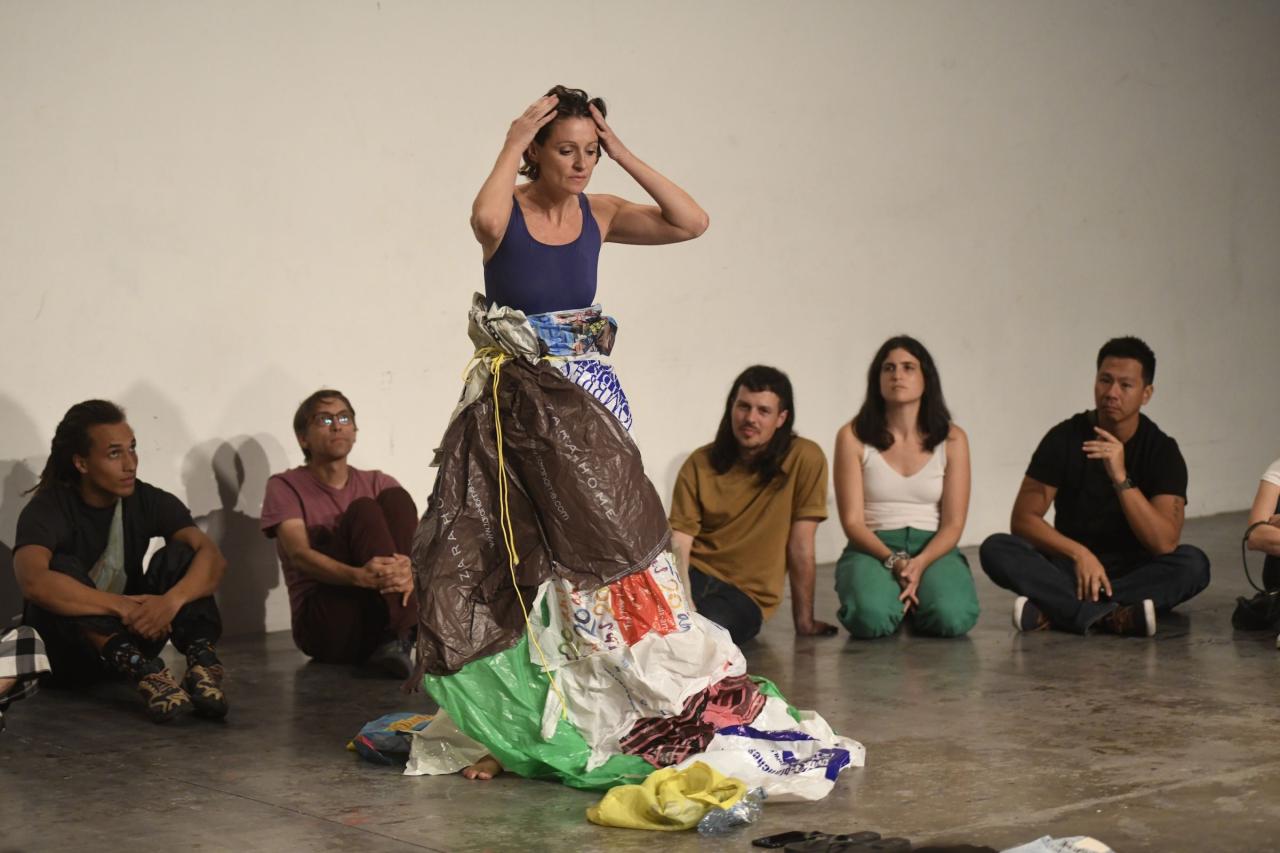 Des sacs plastiques en guise d’accessoire, de la serviette de plage à la robe de cantatrice; accompagnent cette tentation trop grande de chanter. Naviguer entre chanter faux et juste, le chant et la parole; la chanson populaire et l’opéra, que reste-t-il encore à dire, à écouter, à supporter.