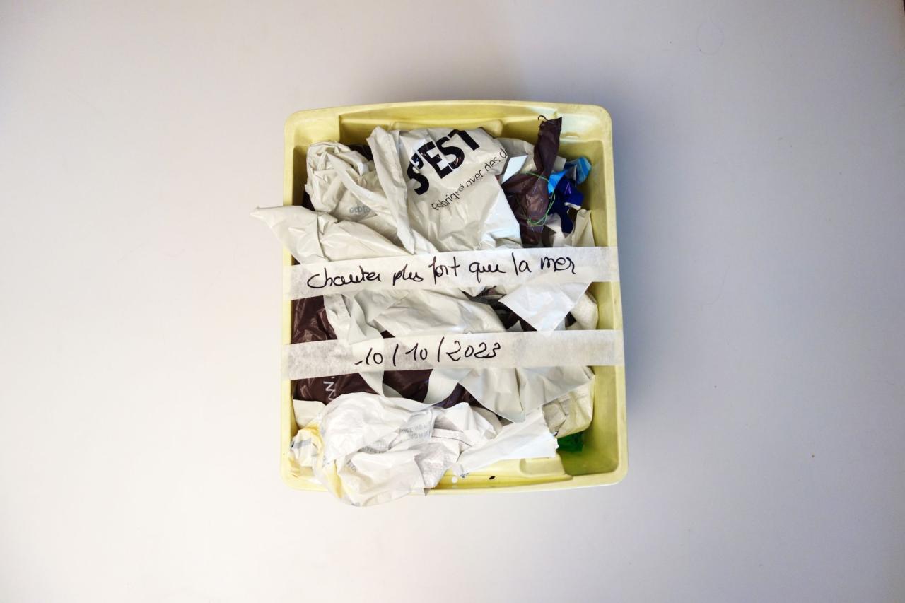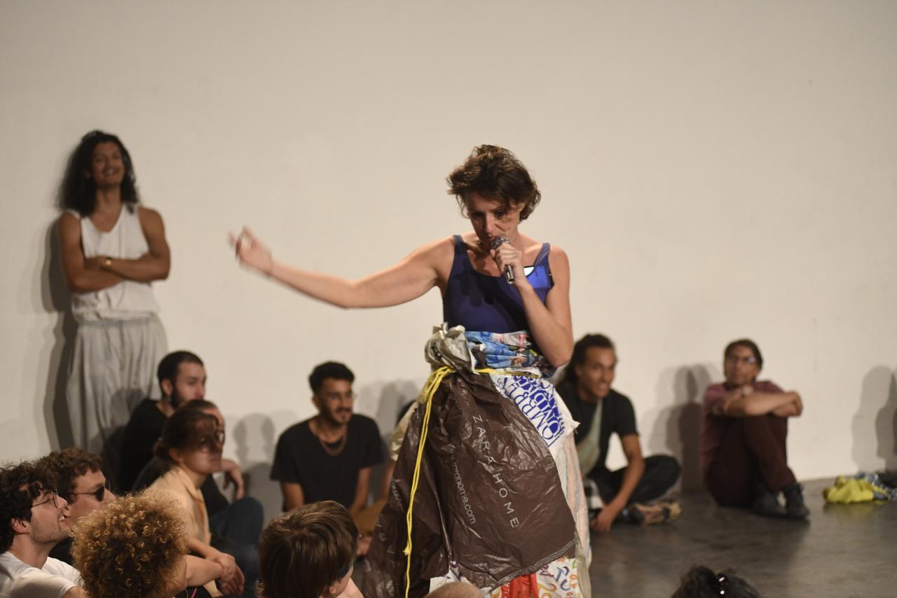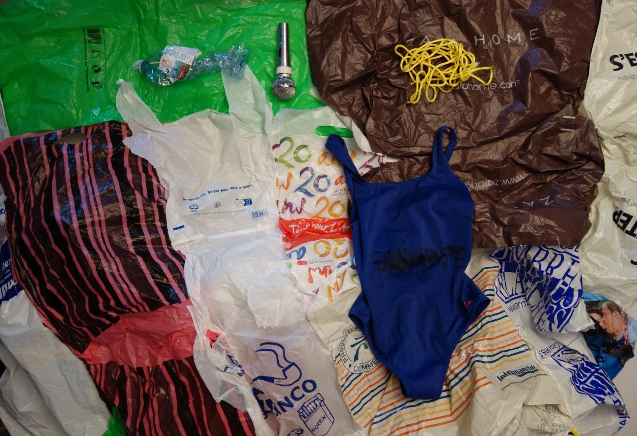 La performance se compose de deux parties : allongée sur un assemblage de sacs plastiques que j’ai cousu à la main, en guise de serviette de plage, je tente de chanter avec de l’eau dans la bouche. La seconde partie, la serviette devient une jupe où je chante une autre chanson au micro.