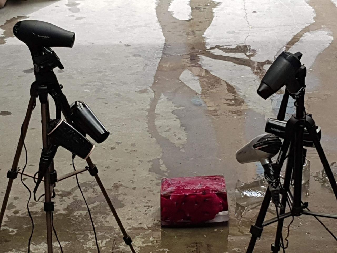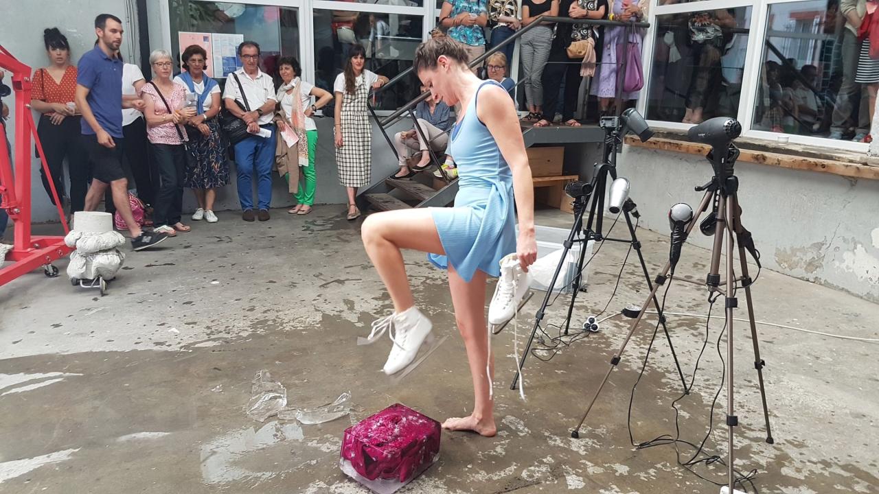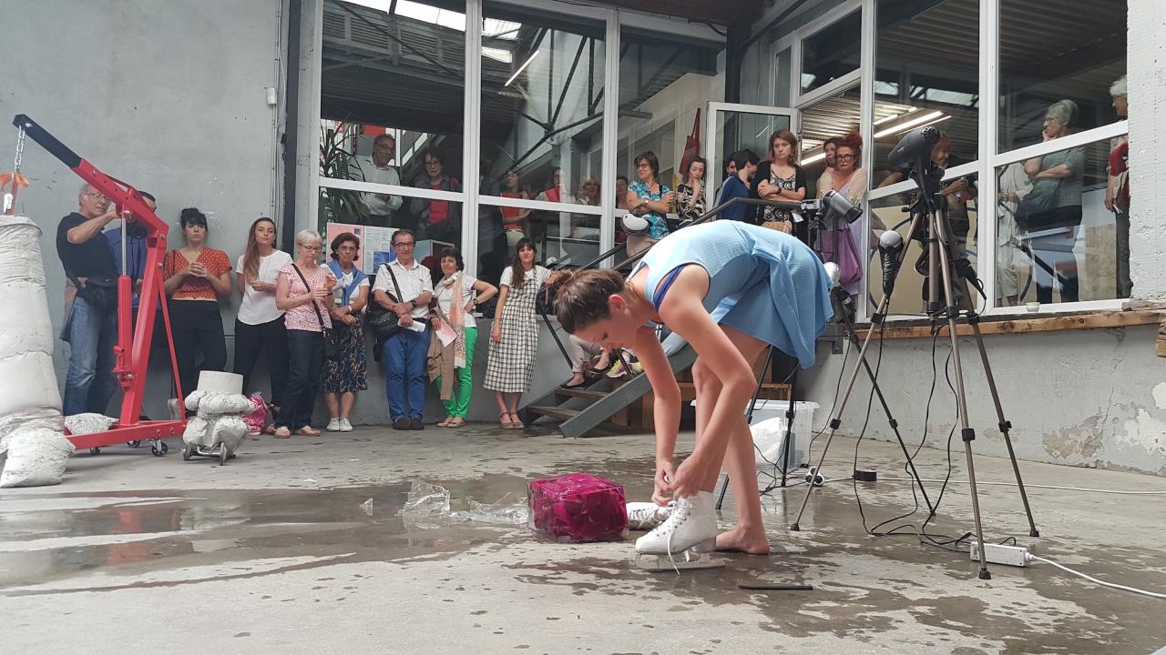 Cette performance est issue d’un travail de recherche que j’ai mené autour de robes congelées en tant que traces des performances passées. Ces sculptures éphémères sont activées lors de performances, comme celle-ci, pendant lesquelles je tente de liberer deux vêtements de leur carapace glacée pour les enfiler. Ici, le titre laisse présager que le processus de libération des deux robes n’a pas pu aboutir complètement.