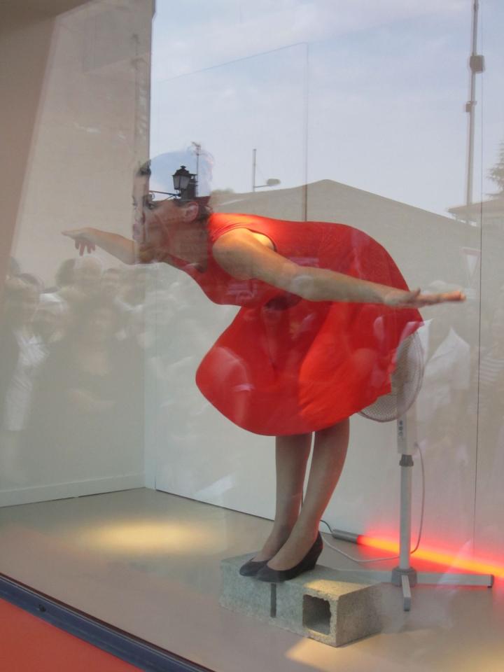 La femme en orange se lève soudain, colle son visage à la vitre pour le défigurer à la façon des enfants, esquisse des gestes d’envol, devient un oiseau grotesque, sort de la vitrine, monte sur une statue de cheval à l’extérieur, se renverse sur le dos et chante, faux, « je ne regrette rien », telle une amazone sans emploi.