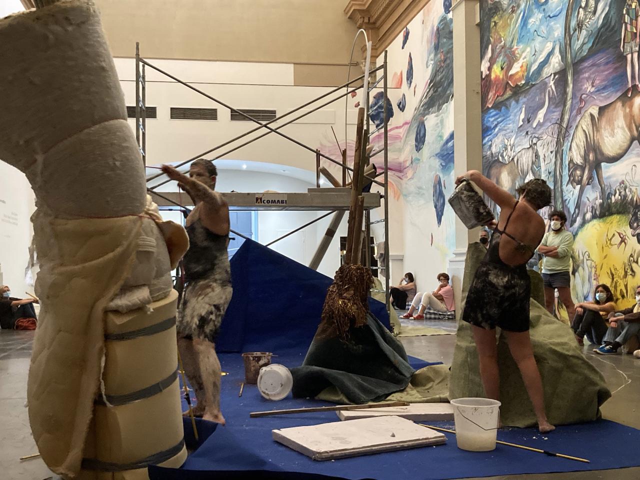 À partir d’argile, terre, cordes et autres matériaux bruts trouvés sur place, nous avons tenté de construire des structures verticales, monochromes, en contraste chromatique avec la profusion des couleurs des peintures monumentales. En vain, car ces constructions précaires se sont inévitablement effondrées.