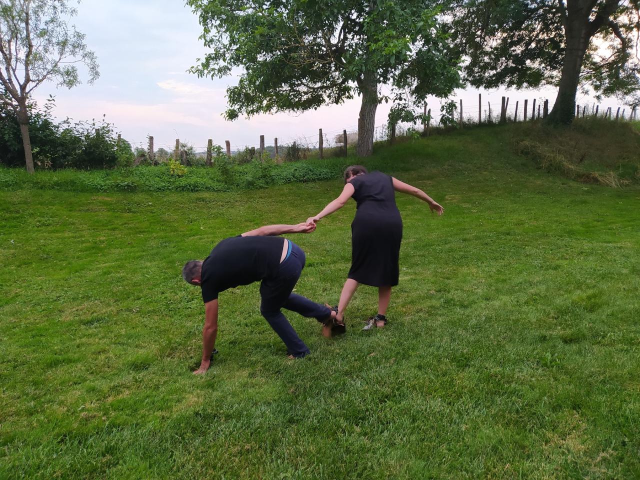 Cette performance s’est construite en collaboration avec Bruno Mercet et à partir de matériaux trouvés sur place et notamment des tuiles en terre-cuite. Avec des tuiles comme chaussures, nous avons mis en scène un jeu subtil et ambivalent entre course, duel ou soutien, à l’image des relations entre hommes et femmes.