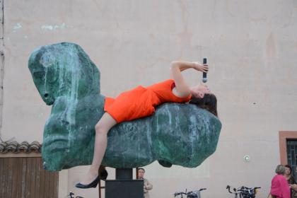 La femme en orange se lève soudain, colle son visage à la vitre pour le défigurer à la façon des enfants, esquisse des gestes d’envol, devient un oiseau grotesque, sort de la vitrine, monte sur une statue de cheval à l’extérieur, se renverse sur le dos et chante, faux, « je ne regrette rien », telle une amazone sans emploi.