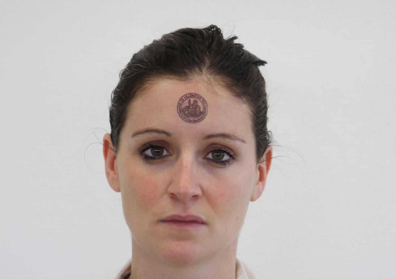 L’invitation est une photographie de femme qui nous regarde. On devine que c’est le visage de l’artiste. Le visage se veut inexpressif, mais il semble un peu triste, désappointé peut-être, comme si ses yeux nous disaient : « rendez-vous compte… ». Mais un autre œil, plus inquiétant et sans regard, se trouve au milieux de son front. Une estampille. Un tampon de la mairie de Villeneuve Tolosane, comme on lit sur le pourtour, avec au centre une figure, la Marianne sans doute. Le tampon n’est pas apposé sur l’image, mais directement sur la peau de la femme. Un tampon atteste de l’authenticité de la chose tamponnée, mais marque aussi sa provenance, certifie, autorise. Estampiller est un geste performatif par excellence : par cela, l’estampillé change de statut symbolique, gagne en existence formelle, mais perd en singularité. Le tampon sur la peau est aussi une tache d’encre qui salit, un stigmate, une verrue. La question de l’expérience que l’on fait d’un espace est au coeur des recherches d’Émilie Franceschin : comment habiter quelque part sans être assigné à un lieu, un rôle, une identité ? En février 2012, elle envoie une invitation pour une ouverture d’atelier. Elle écrit simplement : « Je réside ». Son lieu de résidence s’appelle Le Majorat et se trouve à Villeneuve-Tolosane.
