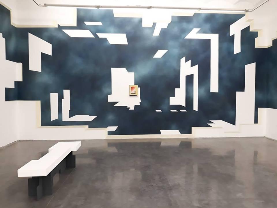Rébecca Konforti, Tour 4 & 6 rue Rambaud, 34000, Montpellier : ouverture sur l’éther, peinture murale à l’acrylique par pulvérisation, dimensions variables à échelle 1 dans tout l’espace d’exposition. Vue de l’installation Temps d’un espace nuit, Frac Occitanie Montpellier, 2018