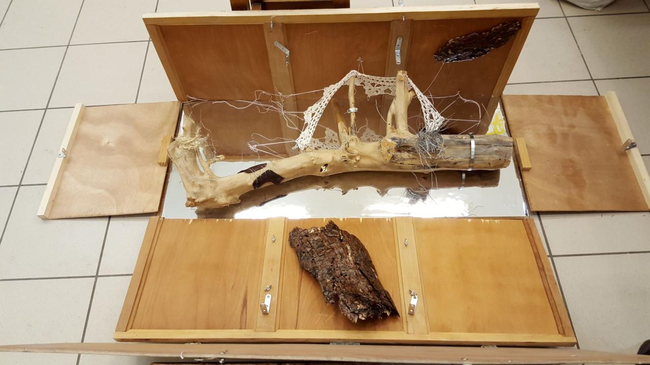 Sylvie Quillet, Émotions, 2018, miroir, écorce, tronc, dentelle, fil de fer, cuir, dimensions variables