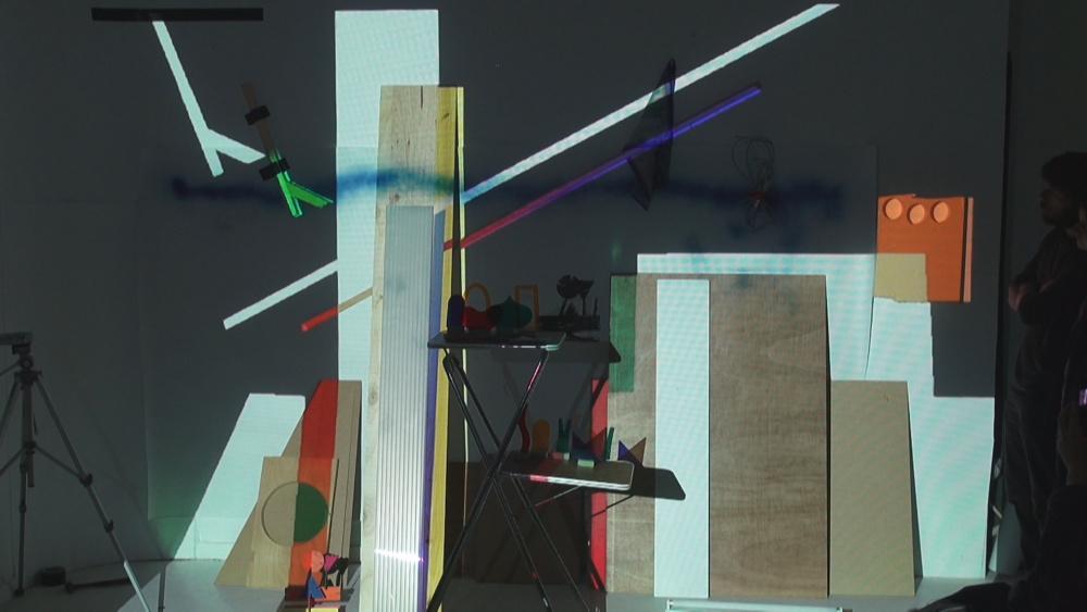 Galerie Rezeda, Dessin Augmenté Live, dessin, peinture, objet, mapping vidéo, dimensions variables, 2015. Vue de l’exposition En Attendant les Cerises Productions, Poitiers, 2015