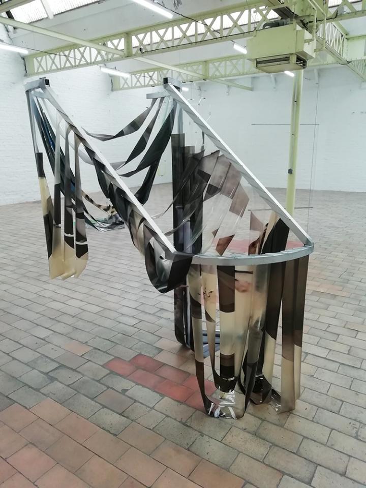 Marie Lelouche, You have a new memory, sculpture, impression UV sur acétate, aluminium, goupilles, Smartphones, application dédiée, tabouret, 2018. Vue de l’exposition Des horizons inversés, Delta Studio, Roubaix, 2018