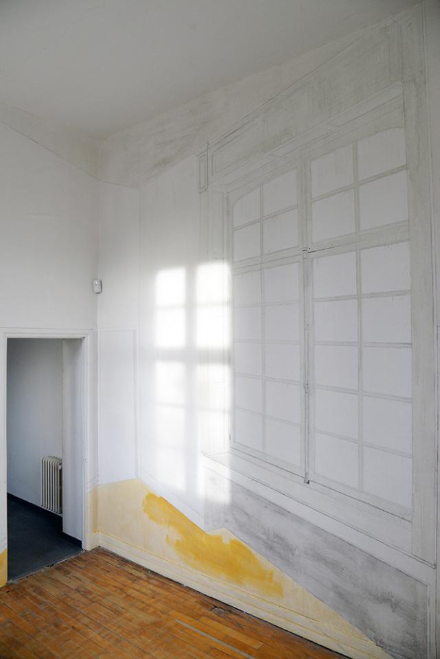 Emmanuel Simon, H(all) over 17 Archipel #2, 2019, peinture murale à l’aquarelle, 420 x 1500 cm, installation en cours