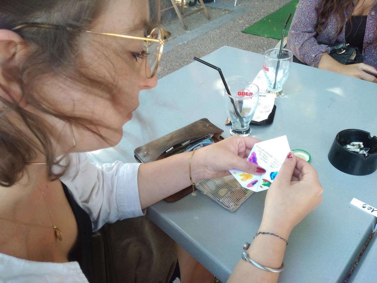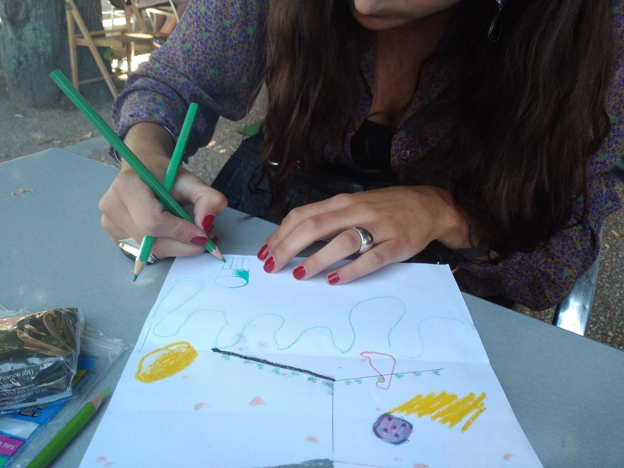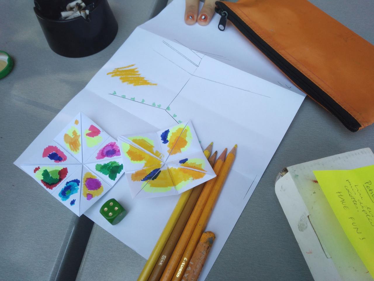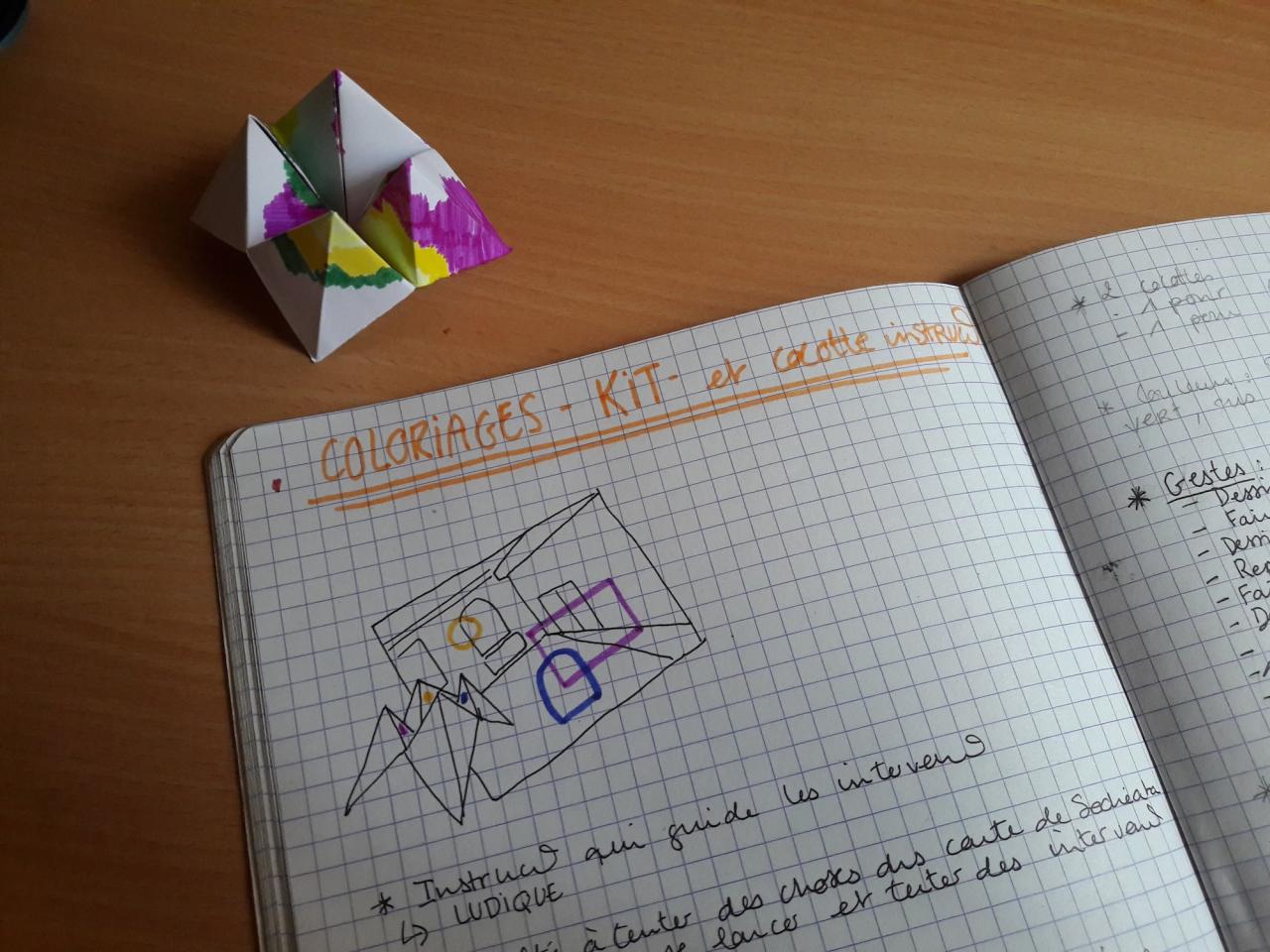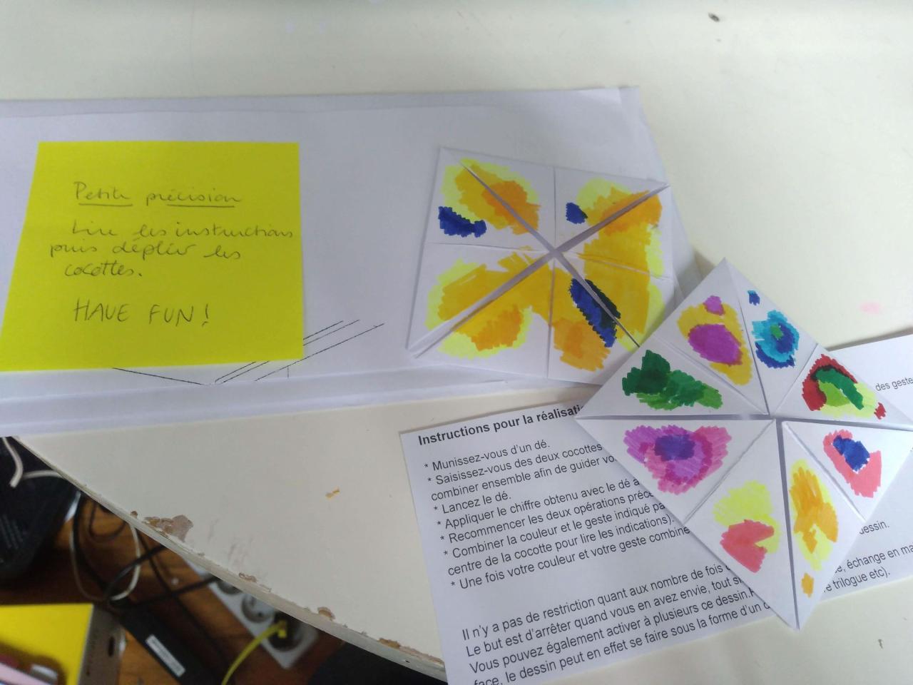 - Ne sachant pas comment intervenir sur la carte, Mathilde réalise sept « kits pour la réalisation de dessins ». Elle choisit sept membres du groupe au hasard et leur envoie deux cocottes qui, grâce au hasard, donneront des indications pour réaliser un dessin sur les croquis d’Emmanuel. Romane, Naomi, Florine et Socheata se prêtent au jeu.