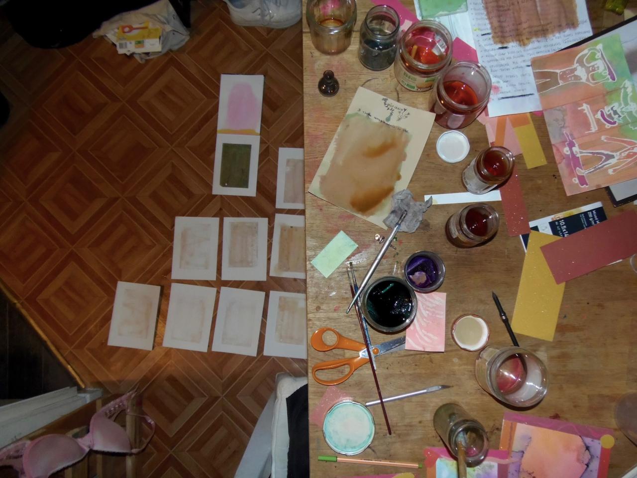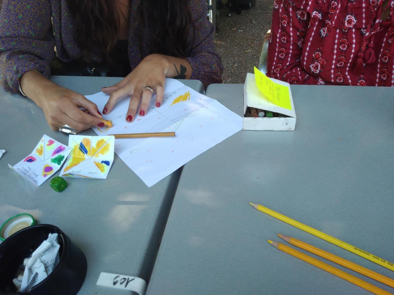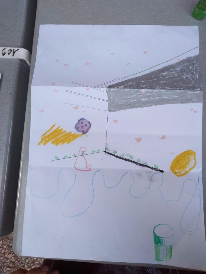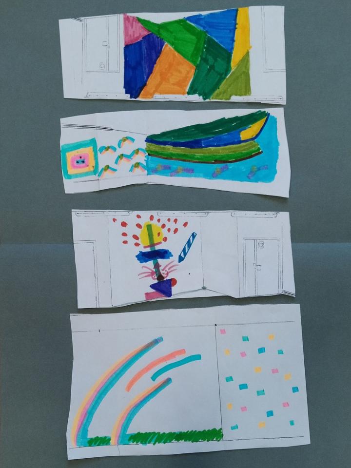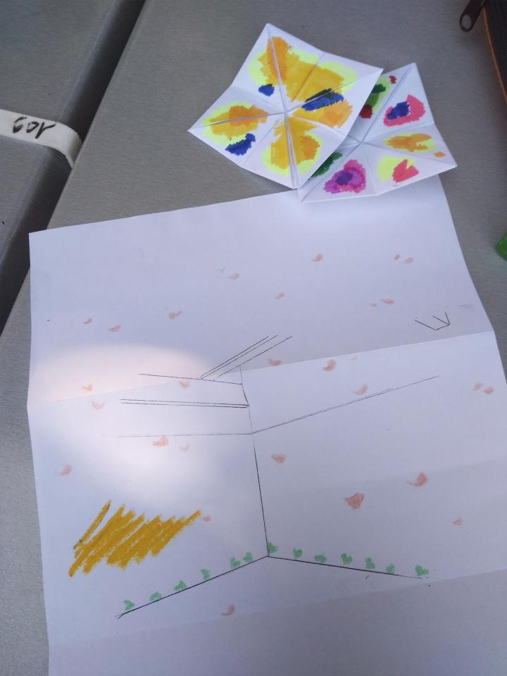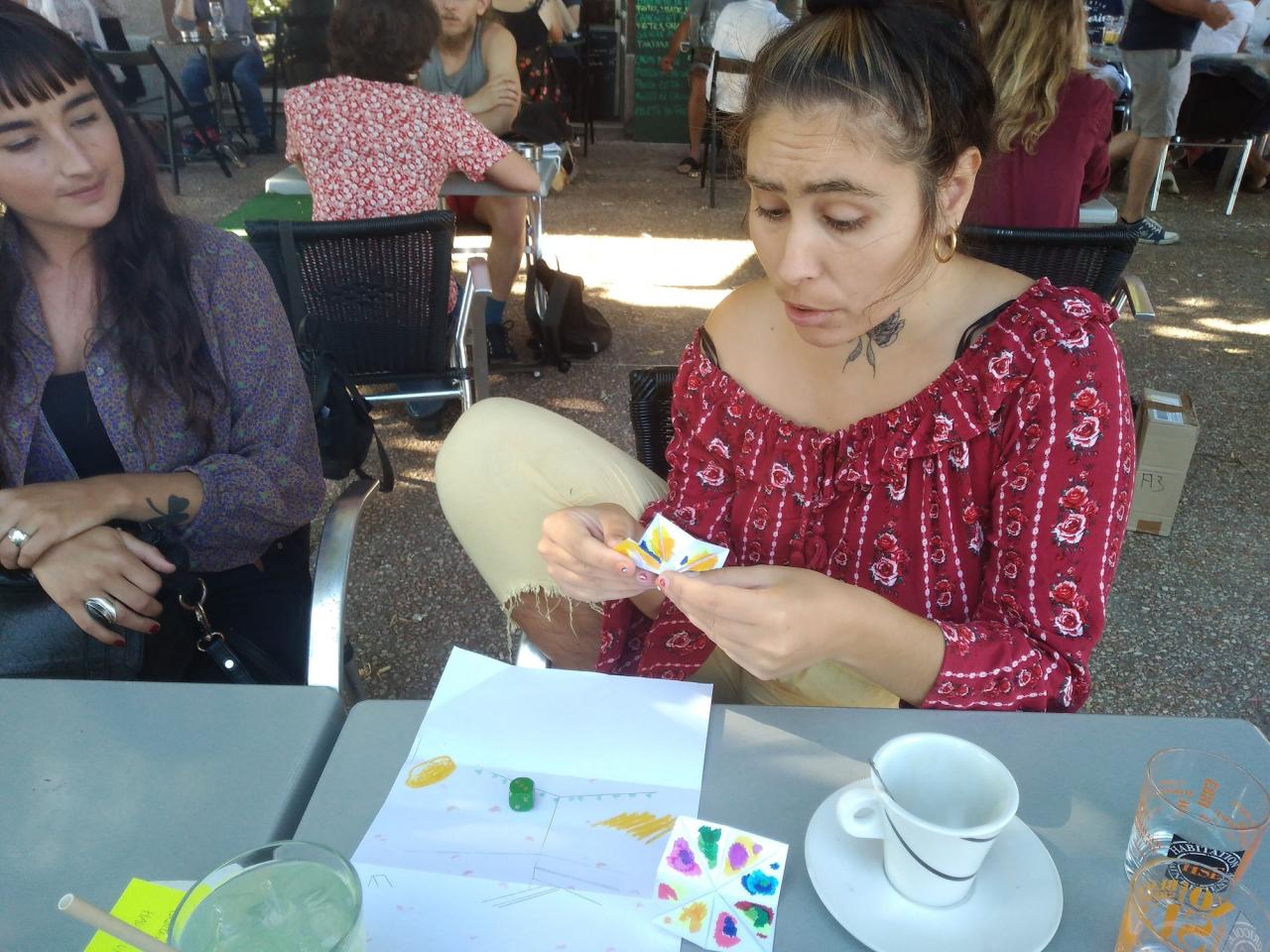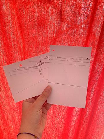 - Ne sachant pas comment intervenir sur la carte, Mathilde réalise sept « kits pour la réalisation de dessins ». Elle choisit sept membres du groupe au hasard et leur envoie deux cocottes qui, grâce au hasard, donneront des indications pour réaliser un dessin sur les croquis d’Emmanuel. Romane, Naomi, Florine et Socheata se prêtent au jeu.