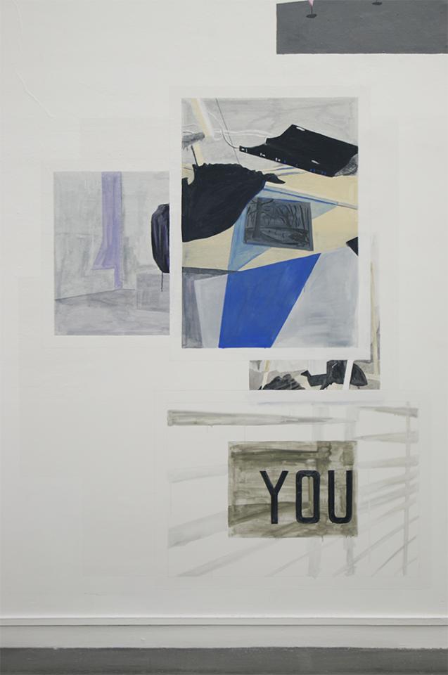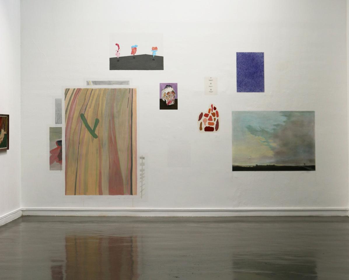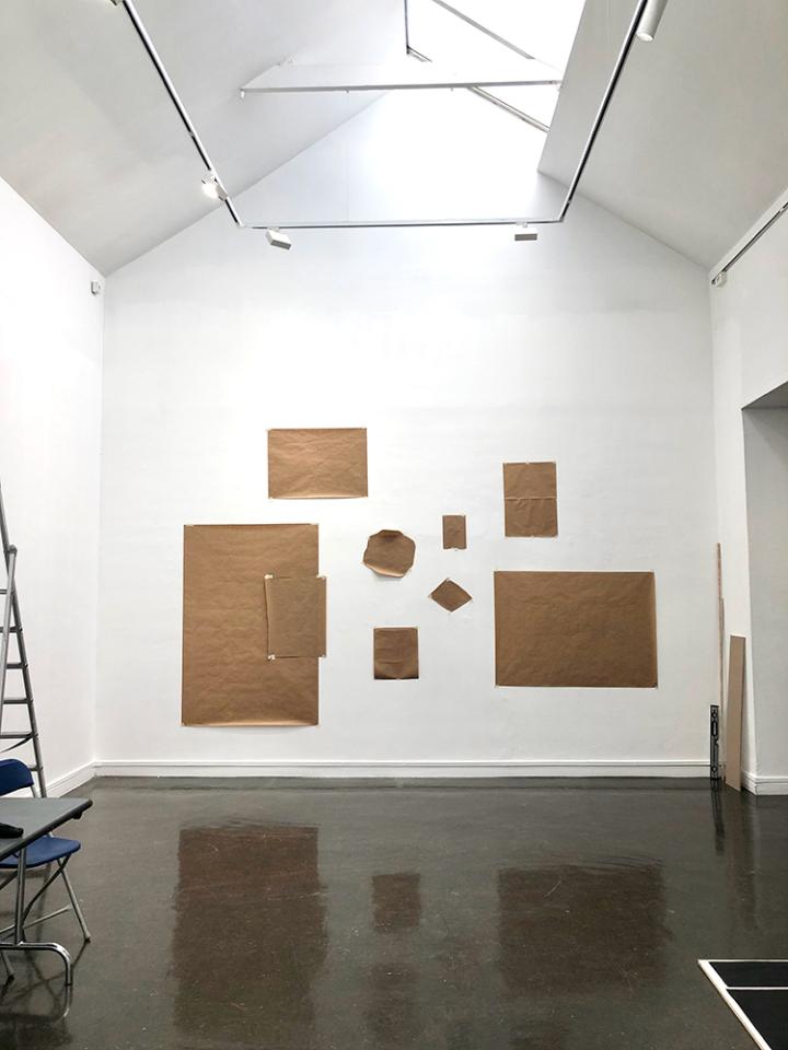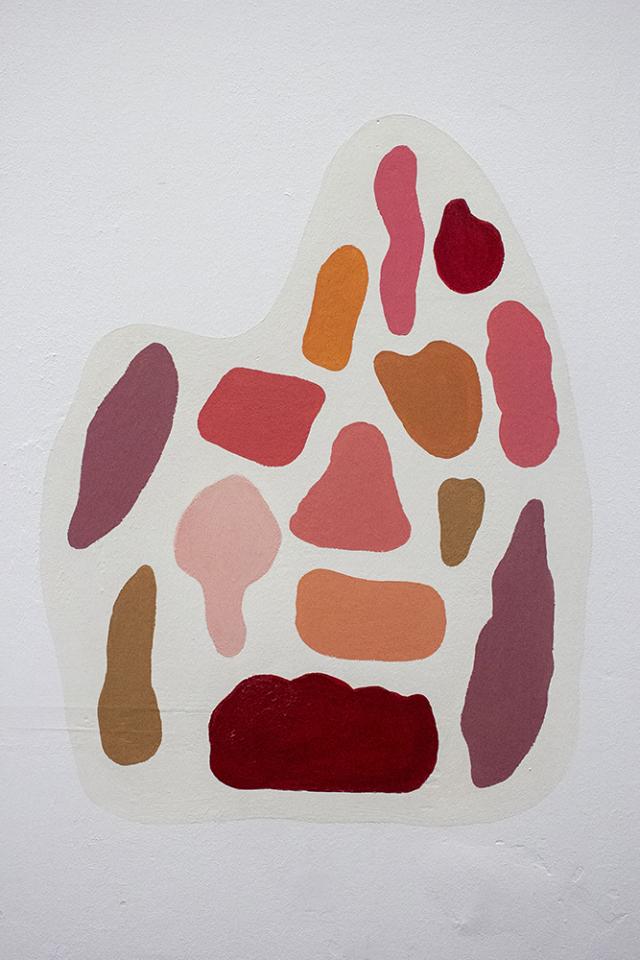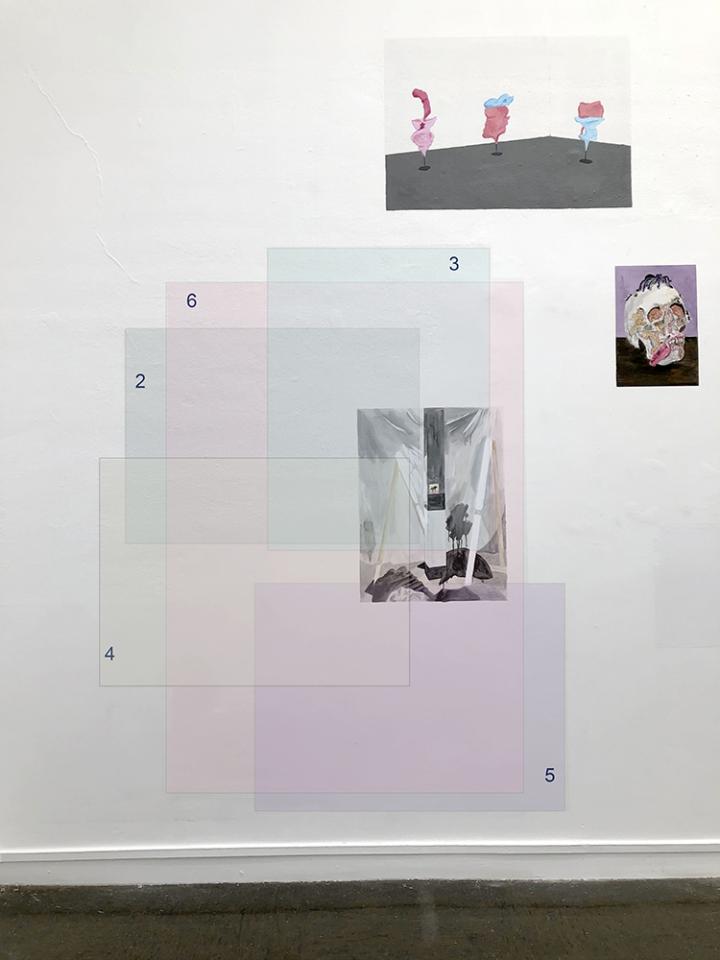 Marion Lebbe, Mur d’oeuvres modèles, 2019, pigments, eau, acrylique, stylo bic, gouache, vue de l’exposition mayonnaise au Centre d’Arts Plastiques et Visuels de Lille