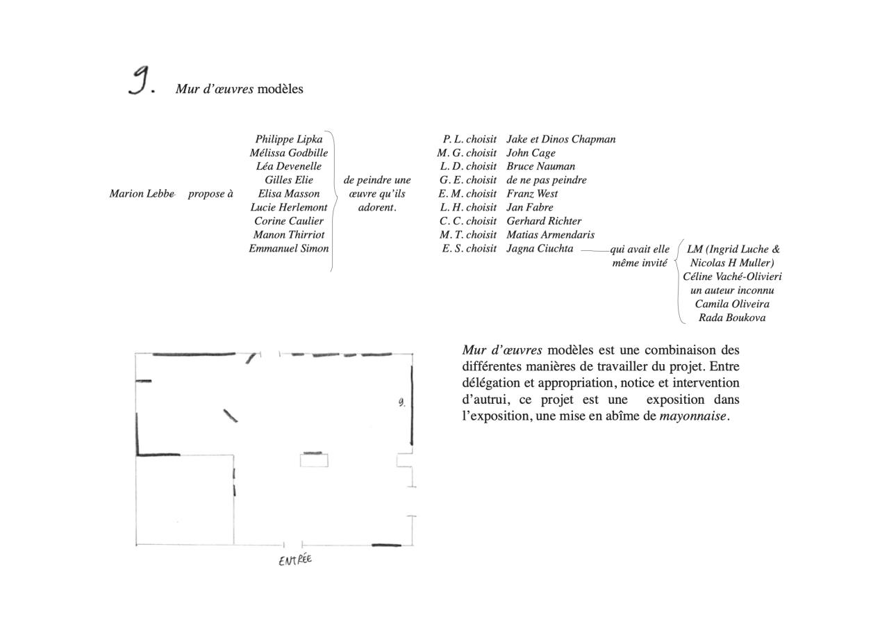 Mur d’œuvres modèles est un protocole de peinture et dessin à réaliser sur un mur. Il invite à reproduire une œuvre (ou sa documentation) que l’on admire ou dont on aurait aimé avoir l’idée, à l’échelle 1:1. Pour l’exposition mayonnaise au CAPV en 2019 l’ensemble des artistes est invité à l’activer, ce qui résulte en un simili d’accrochage de peintures, partition, photos et sculpture.