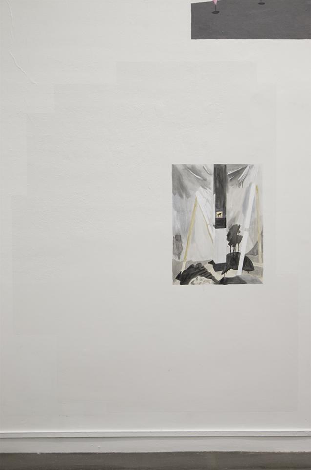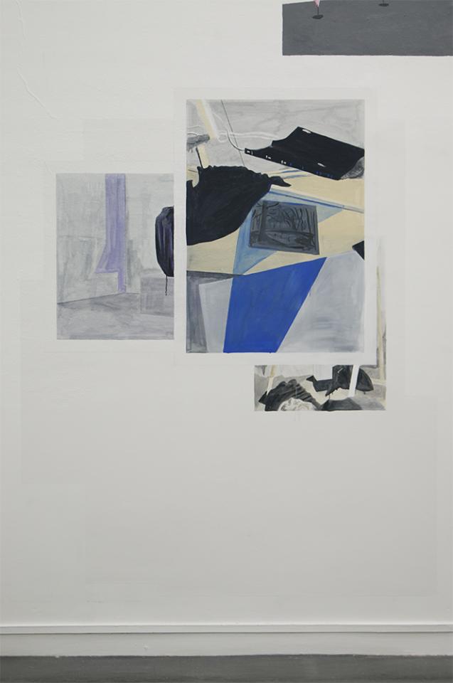 Je te joins également des photos du mur de Marion et la première étape de ma peinture d’All available light. Marion m’a préparé 6 formats en se basant sur les formats des photos que tu avais imprimées puis présentées en vis-à-vis de tes scénographies. Je vais retourner sur place 5 fois durant l’exposition pour réaliser les autres peintures.