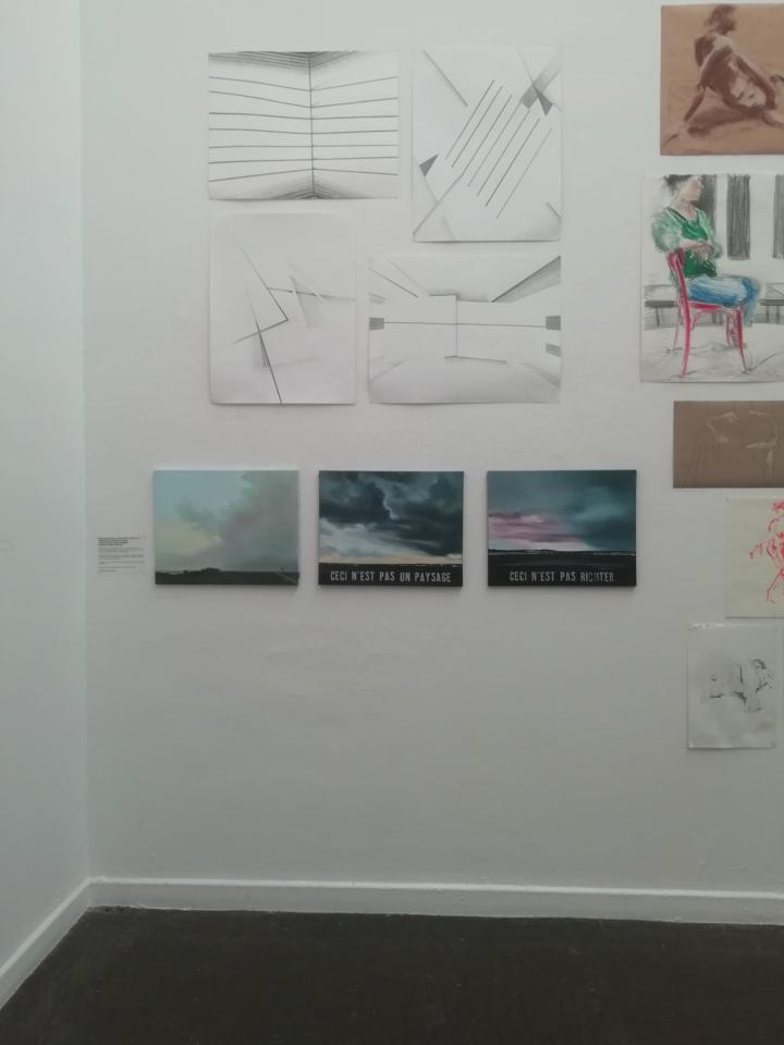Il y a également cette exposition actuellement à la Piscine à Roubaix, Les tableaux fantômes de Bailleul. Ces histoires de copie/réappropriation me semblent en adéquation avec le contexte de résidence, dans des écoles d’arts plastiques où la copie peut être un moyen d’apprentissage. Un cadre où il peut être parfois difficile pour les élèves de sortir du sujet et d’avoir assez d’inspiration pour se lancer. Comme Colette qui réalise des copies d’œuvres qu’elle trouve sur internet tout en écrivant derrière son tableau “à la manière de …”. Ou Corine qui fait des peintures d’après les paysages de Richter tout en y ajoutant une phrase à la Magritte “ceci n’est pas un …”.