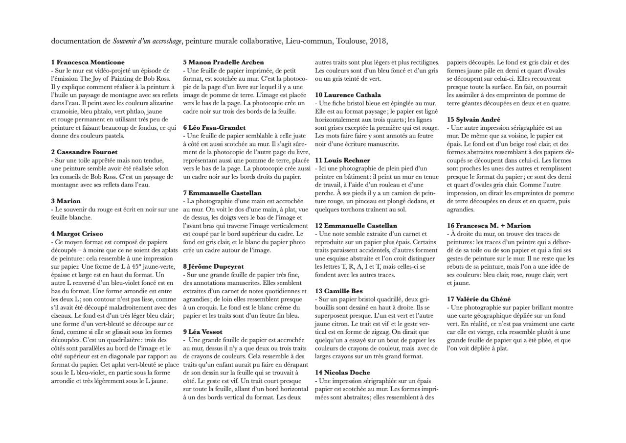 Le principe est toujours le même, j’écris un texte qui décrit un accrochage d’œuvres, c’est une sorte de partition. Je propose à des personnes choisies une description d’œuvre chacun qu’ils ont le temps de lire, ils peuvent même se préparer à l’avance (croquis etc…). Ils les réalisent par la suite sur des fonds blancs teintés que j’ai peint au préalable sur le mur, comme des feuilles blanches. En peignant ces fonds blancs je compose « l’accrochage » sur le mur et le reste est confié aux peintres.